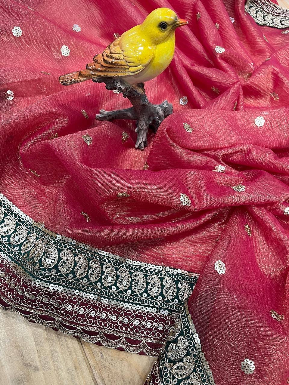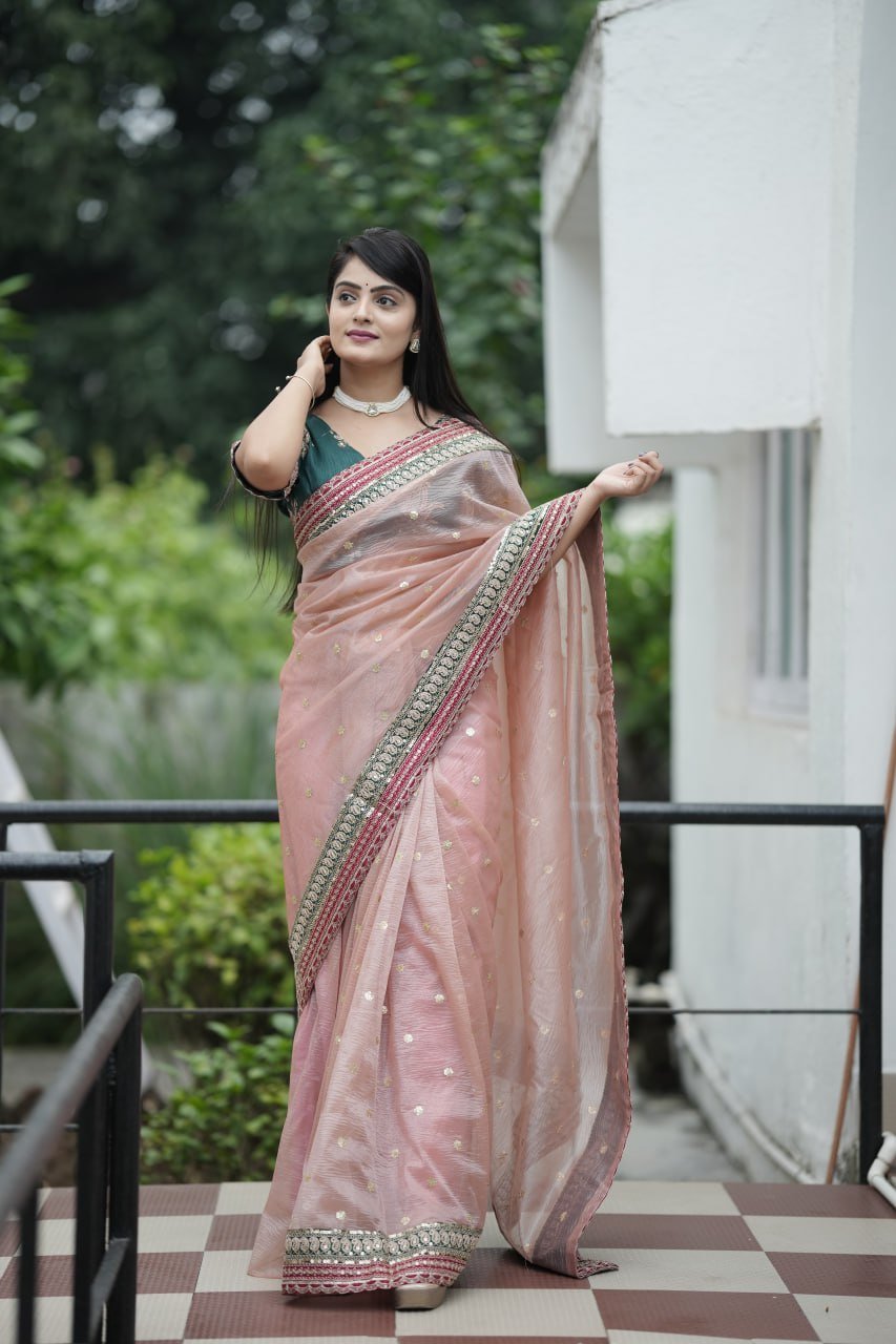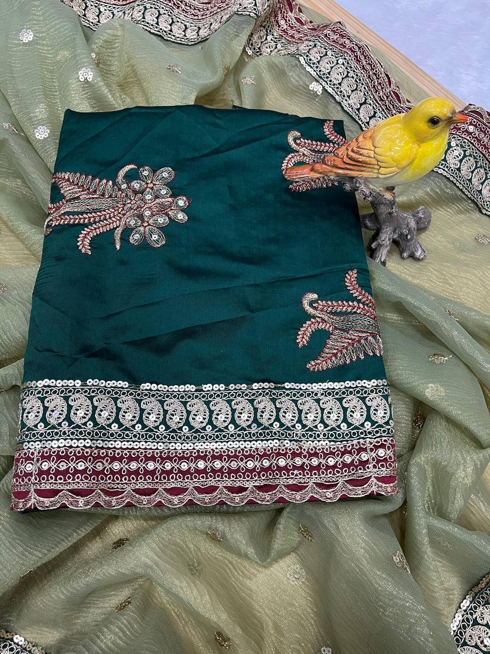 Banarasi Zari Embroidered & Sequins Work Saree with Bottle Green Blouse