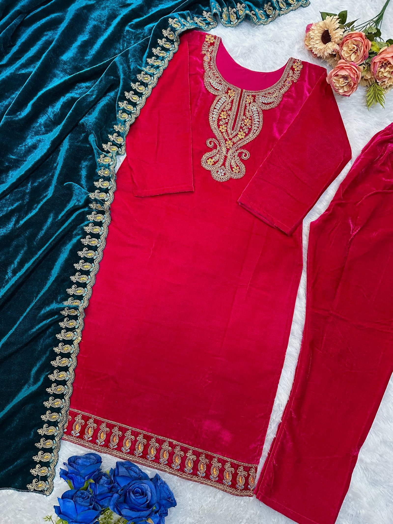 Beautiful Heavy Velvet Embroidered Suit Set with Border Cutwork Dupatta