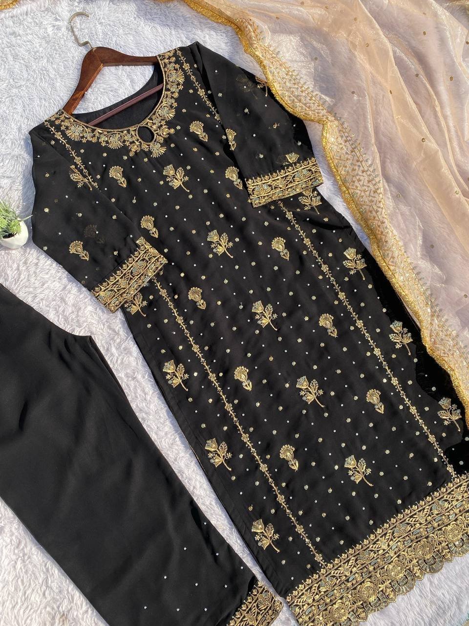 Black Georgette Straight Fit Set, Dupatta with Sequins Embroidery & Moti Work