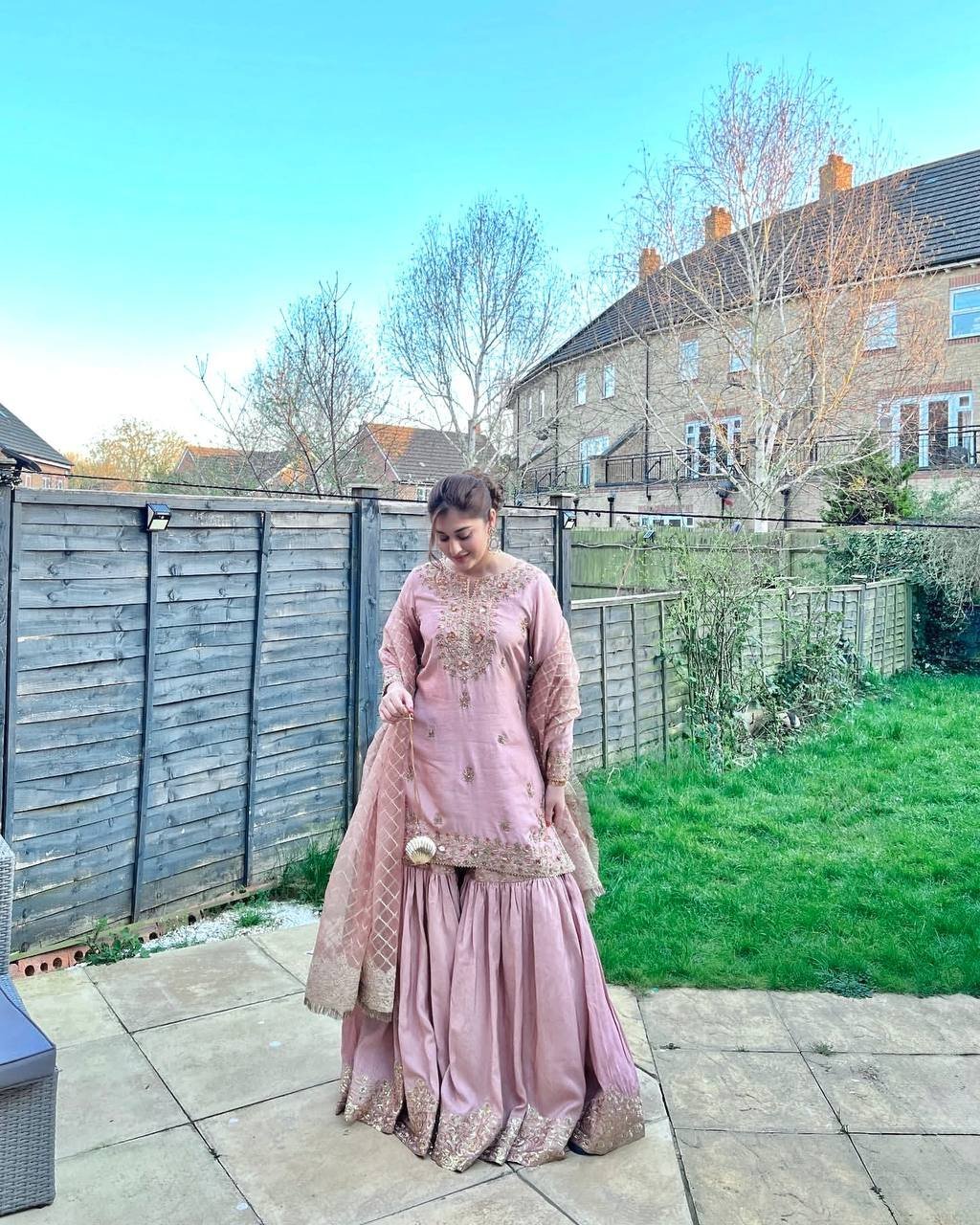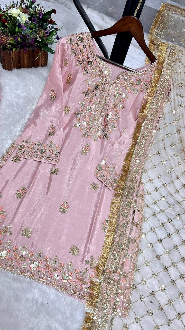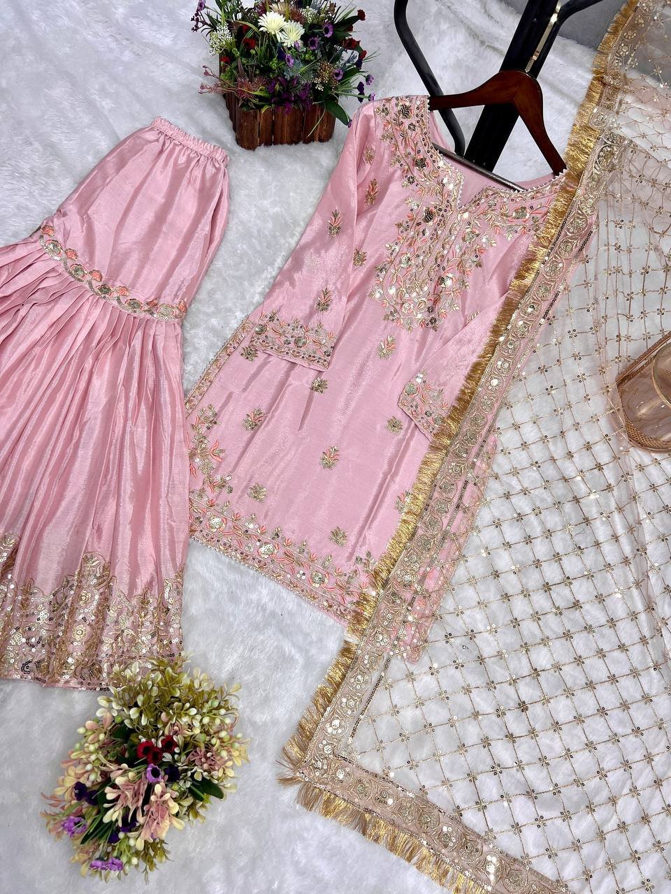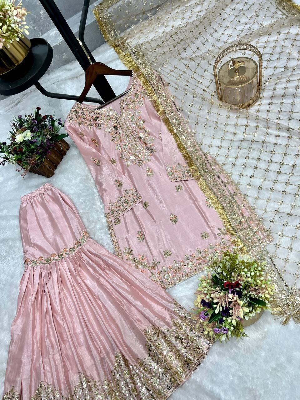 Chinon Silk Beautiful kurta Sharara Set – Baby Pink Sequins Embroidered 3 Pc Suit