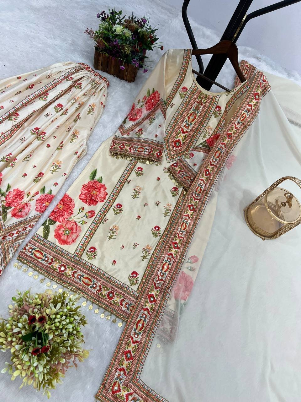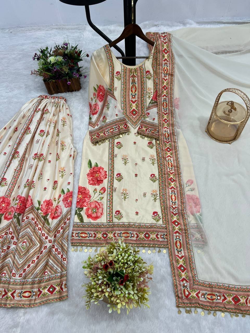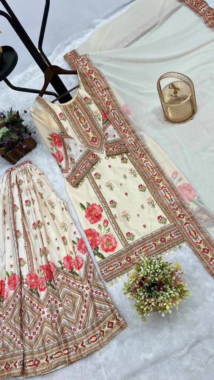 Chinon Silk Digital Prinmted Kurta Sharara Set with Mirror & Stone Hand Work