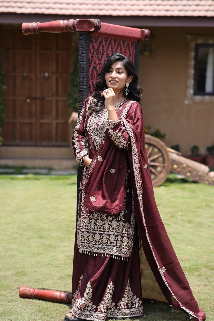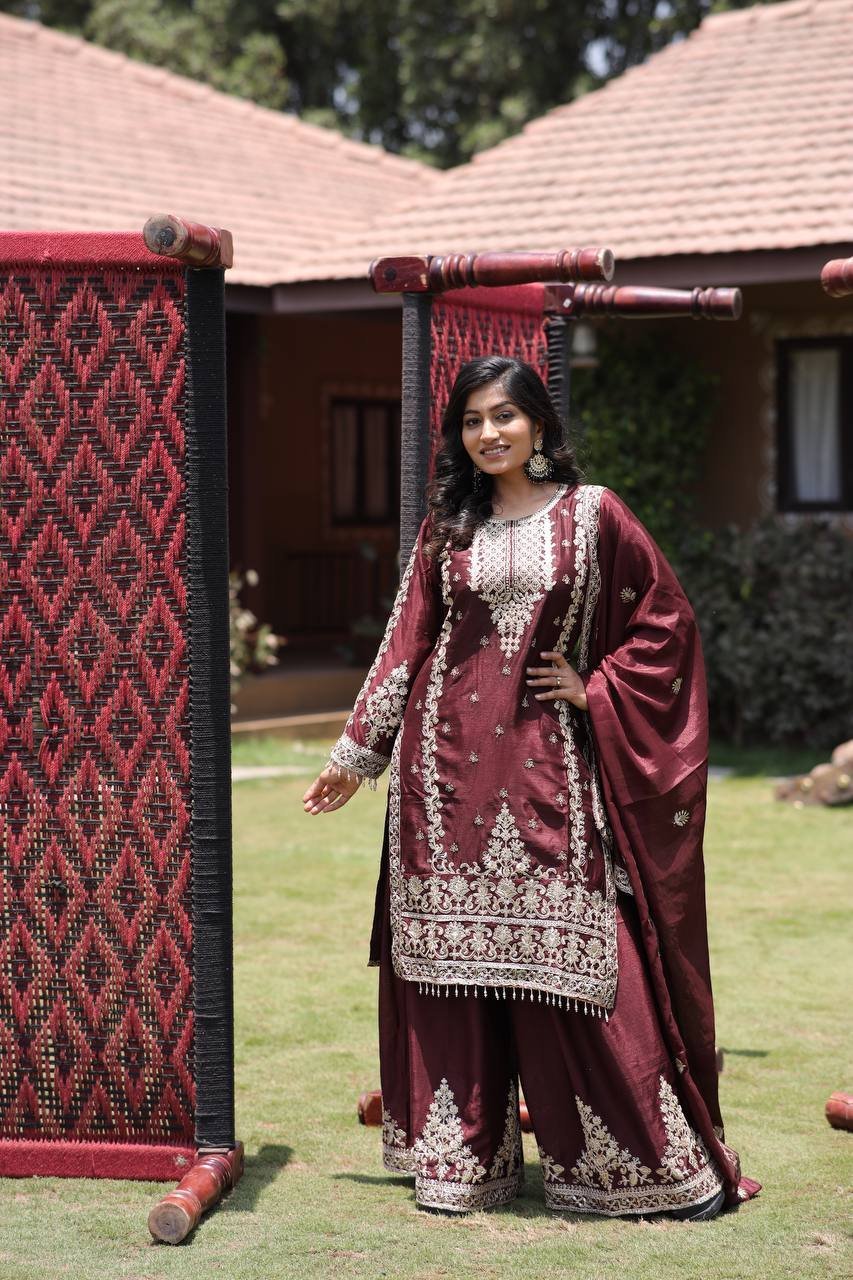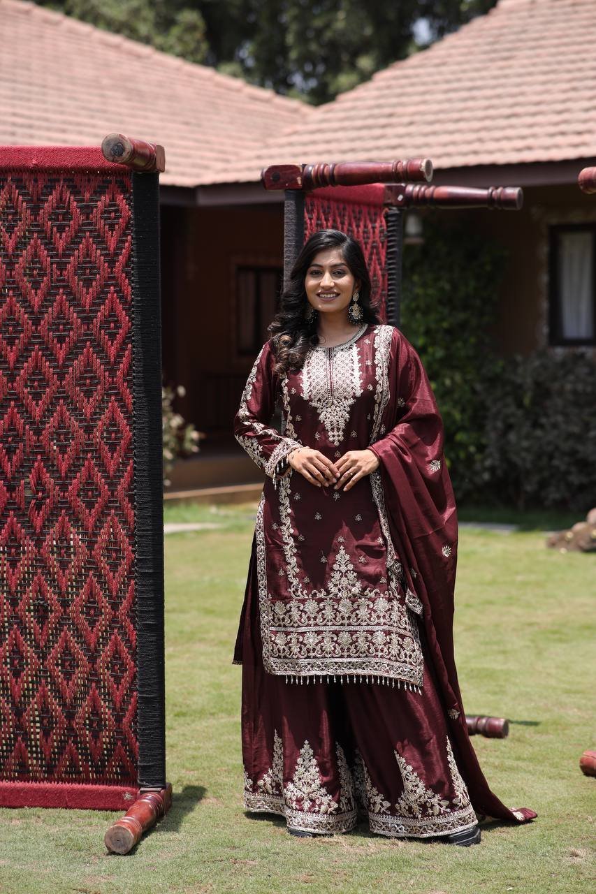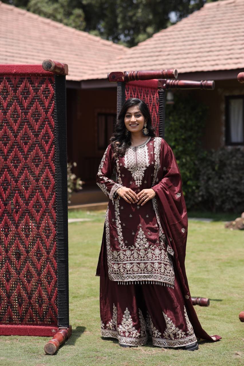 Chinon Silk Kurta Palazzo Set – Maroon Multi Needle Embroidered Work for Occasions