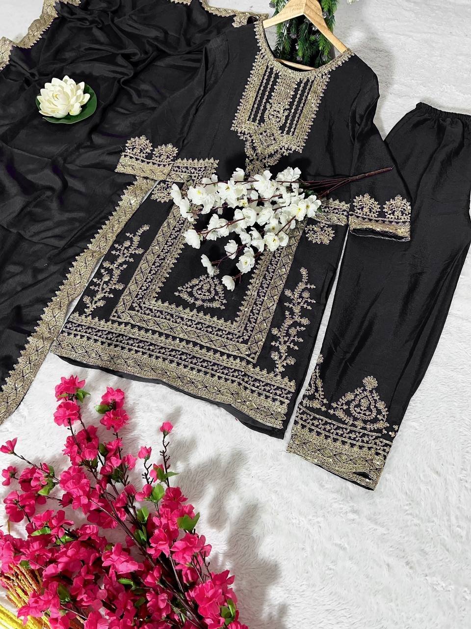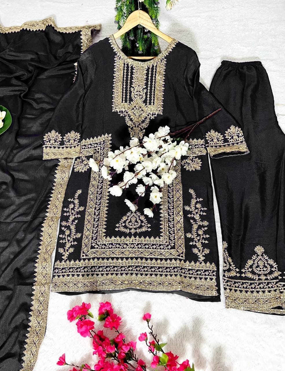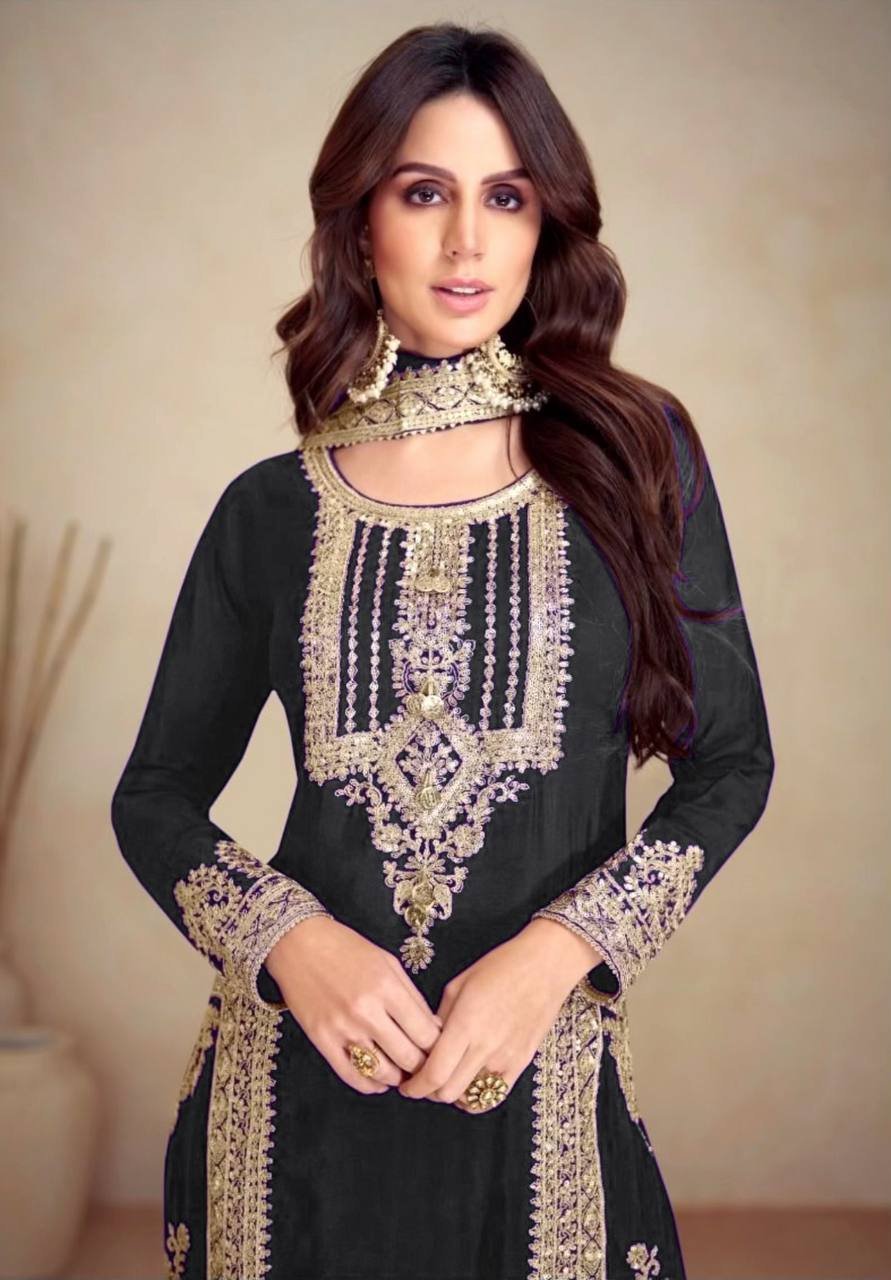 Chinon Silk Multi Needle & Sequins Embroidered Black Straight Fit
