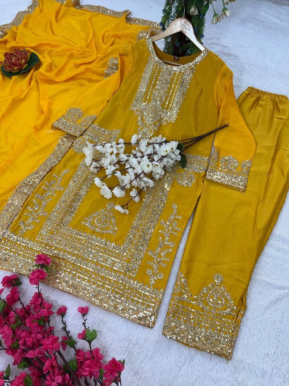 Chinon Silk Multi Needle & Sequins Embroidered Mustard Straight Fit