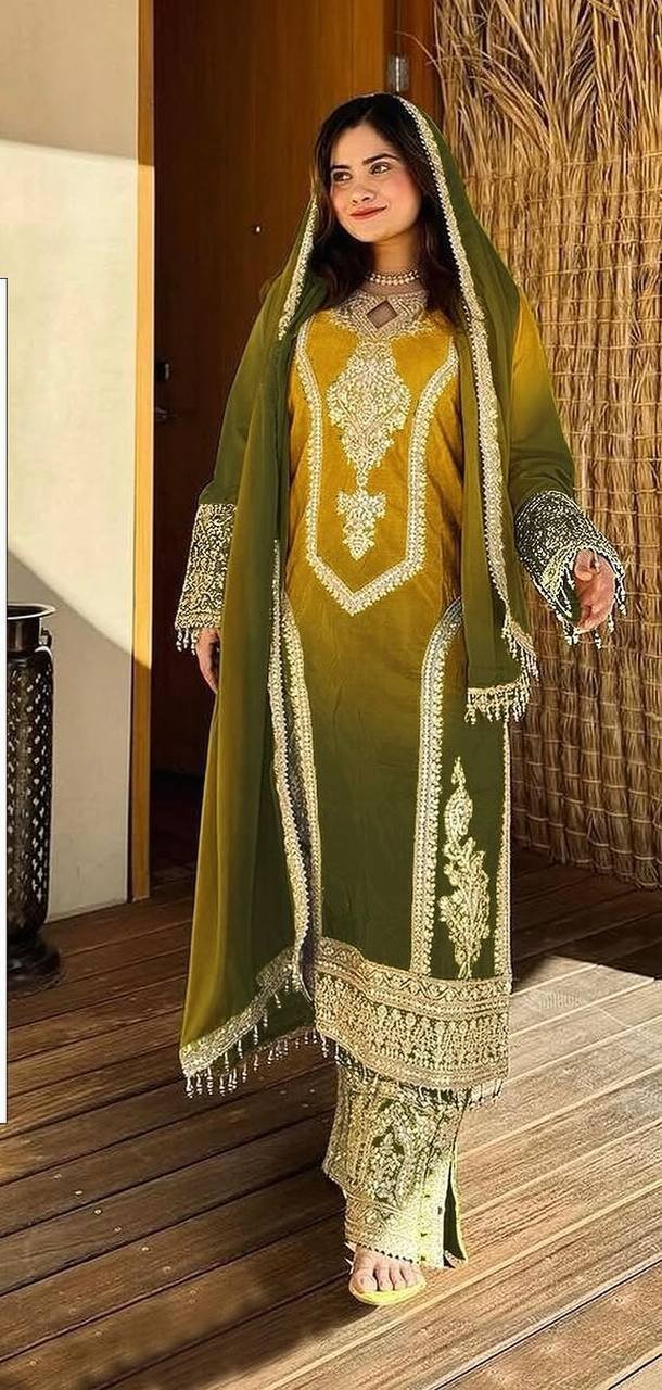 Chinon Silk Yellow Dual Tone Set – Ethnic Heavy Embroidered Work with Fancy Latkans Suit