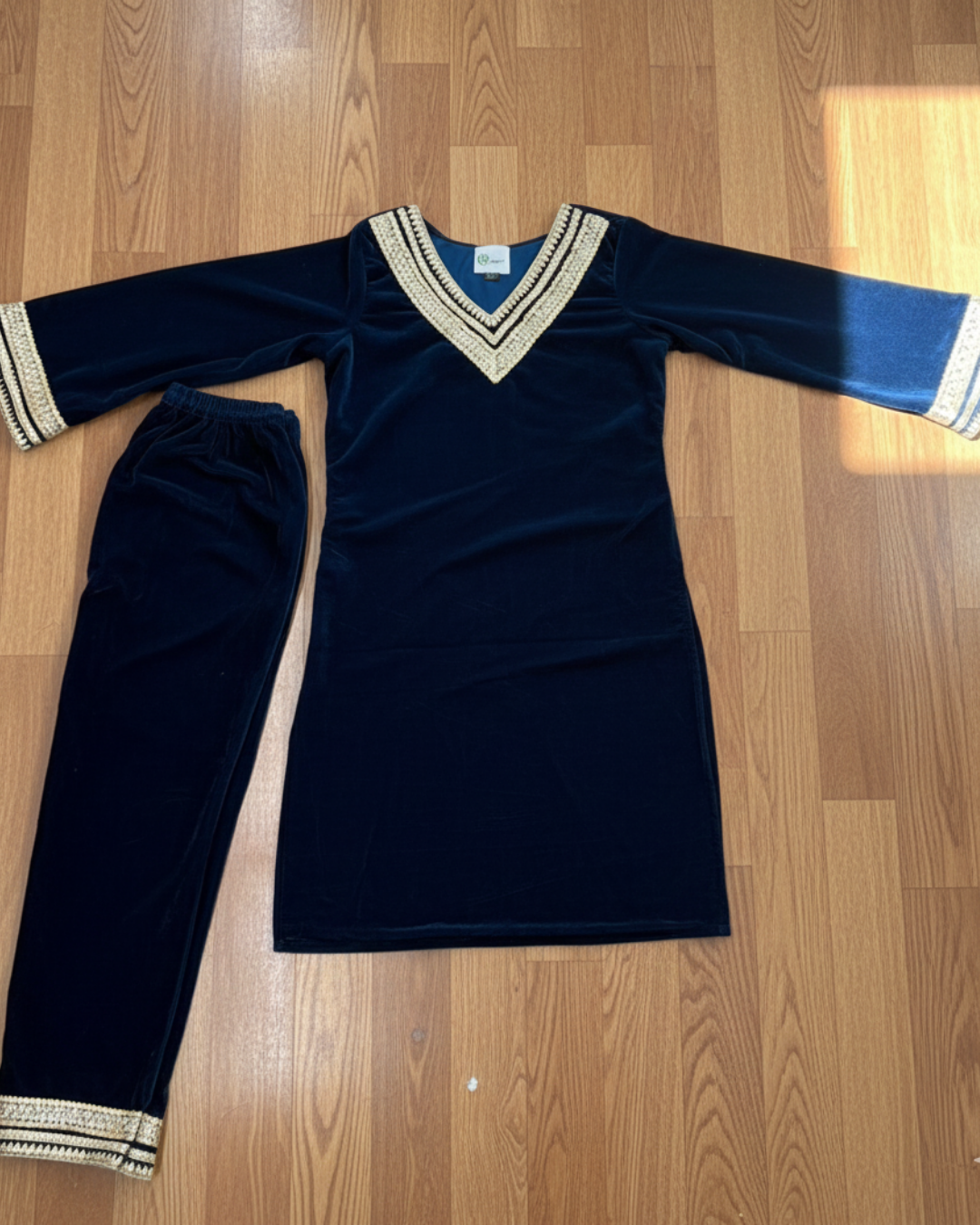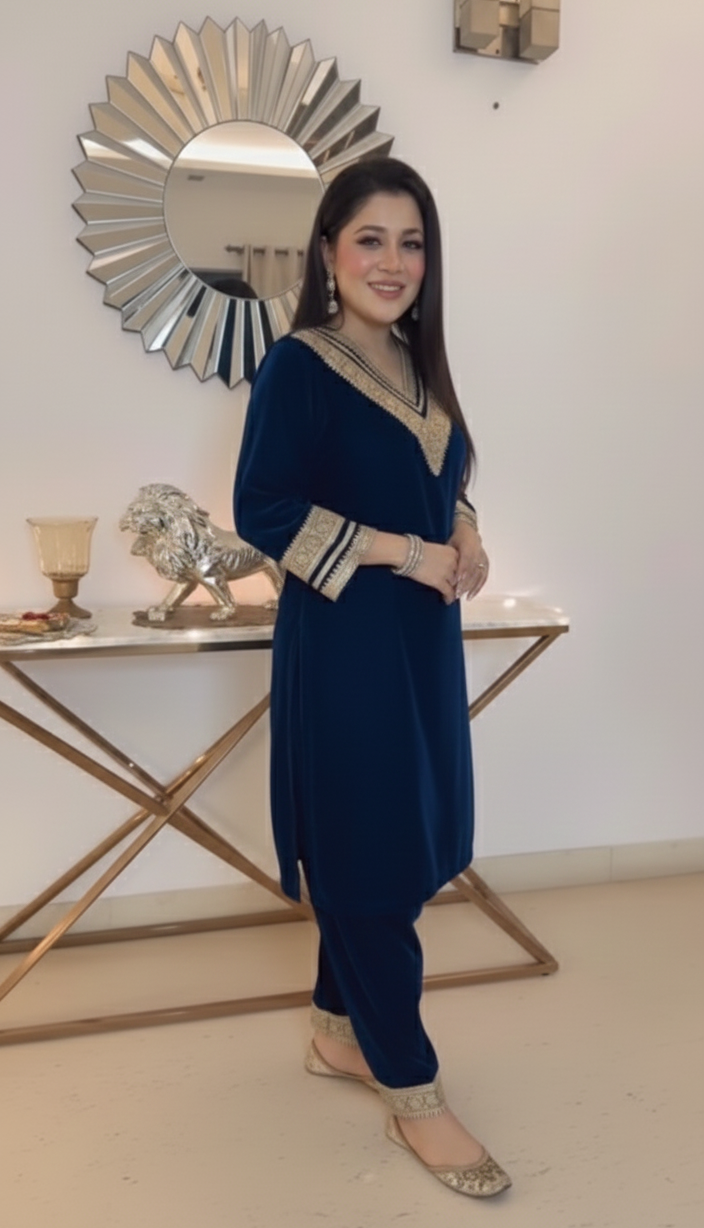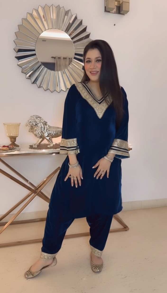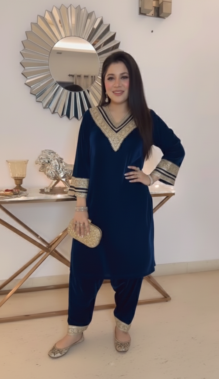 Designer Blue Velvet Embroidered and Lace work Kurta Palazzo Set