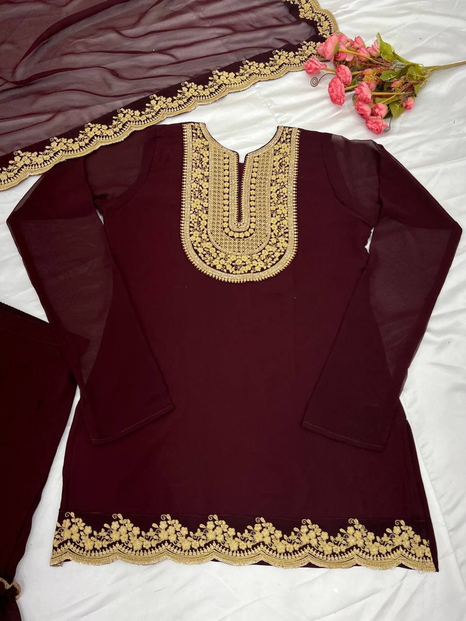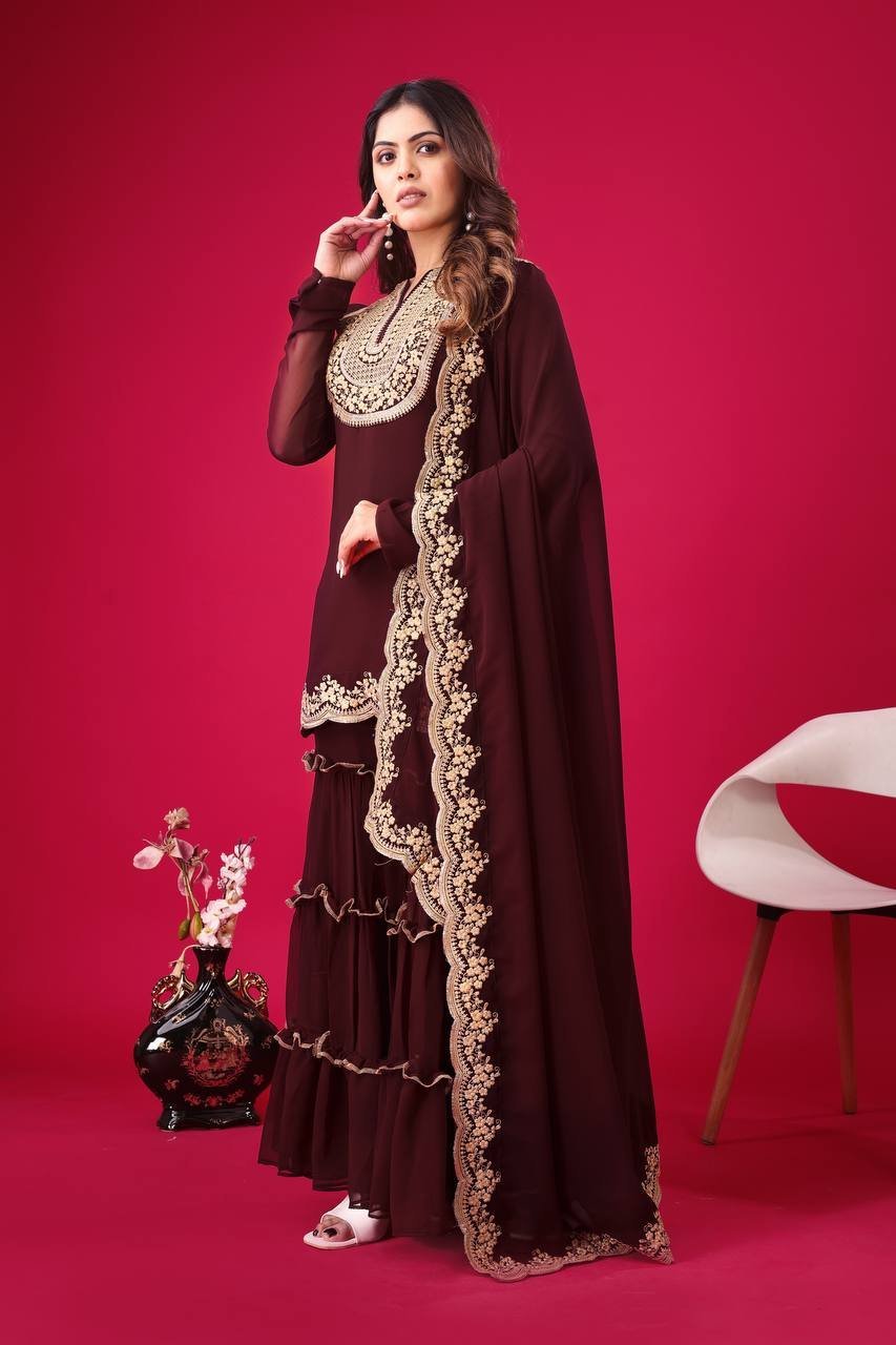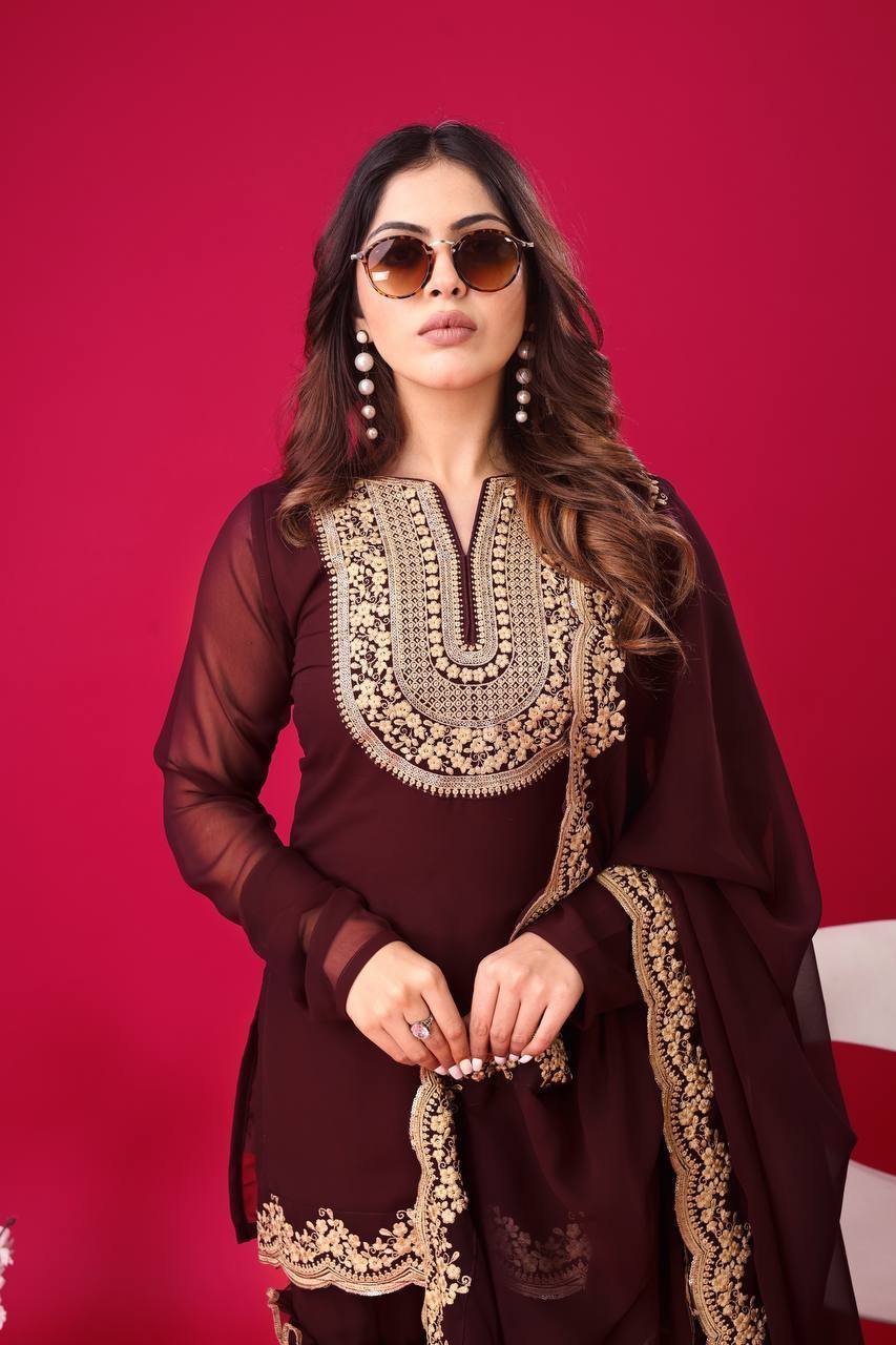 Elegant Maroon Blooming Georgette Palazzo Set with Thread & Sequins Embroidery Work
