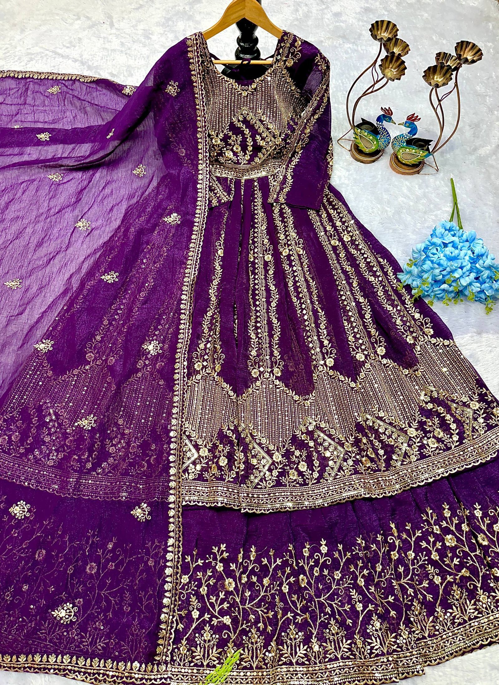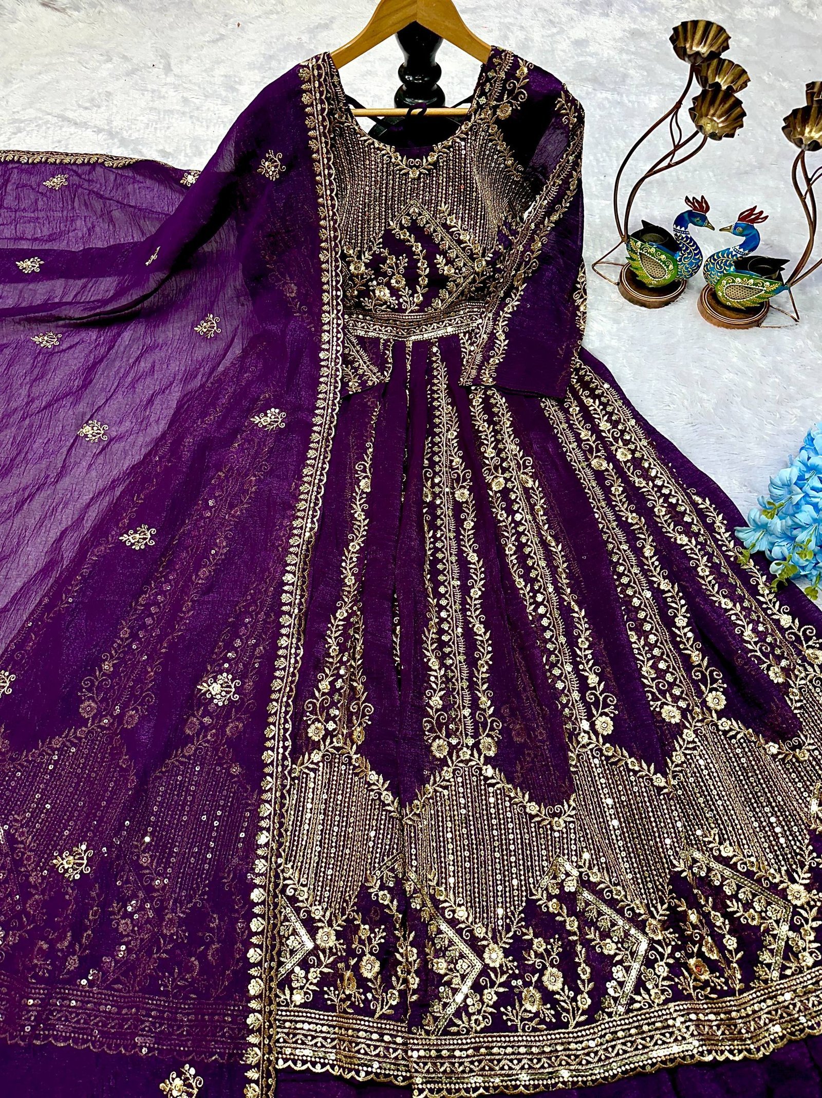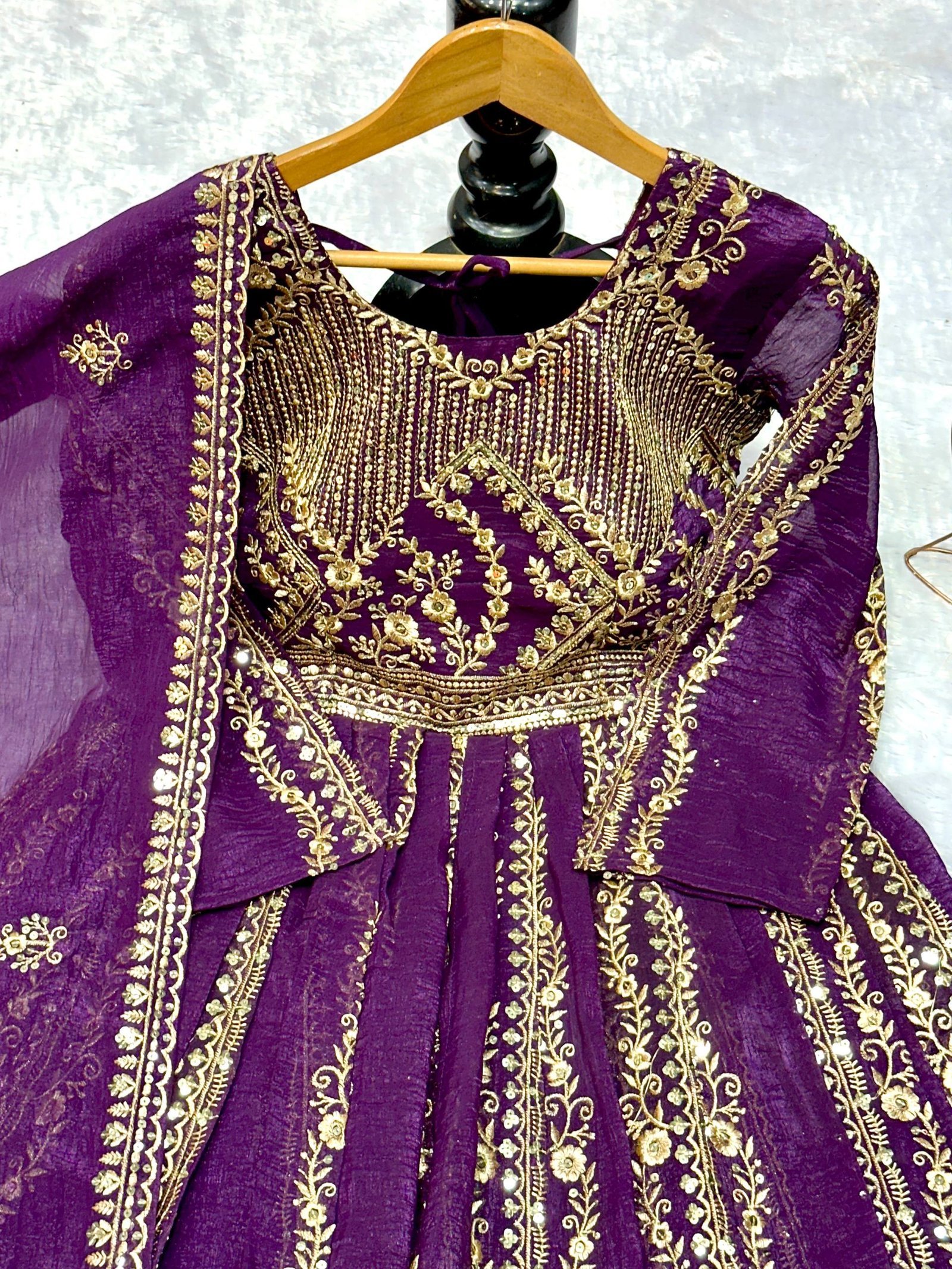 Elegant Purple Crunchy Silk Embroidered Anarkali with Lehenga Set