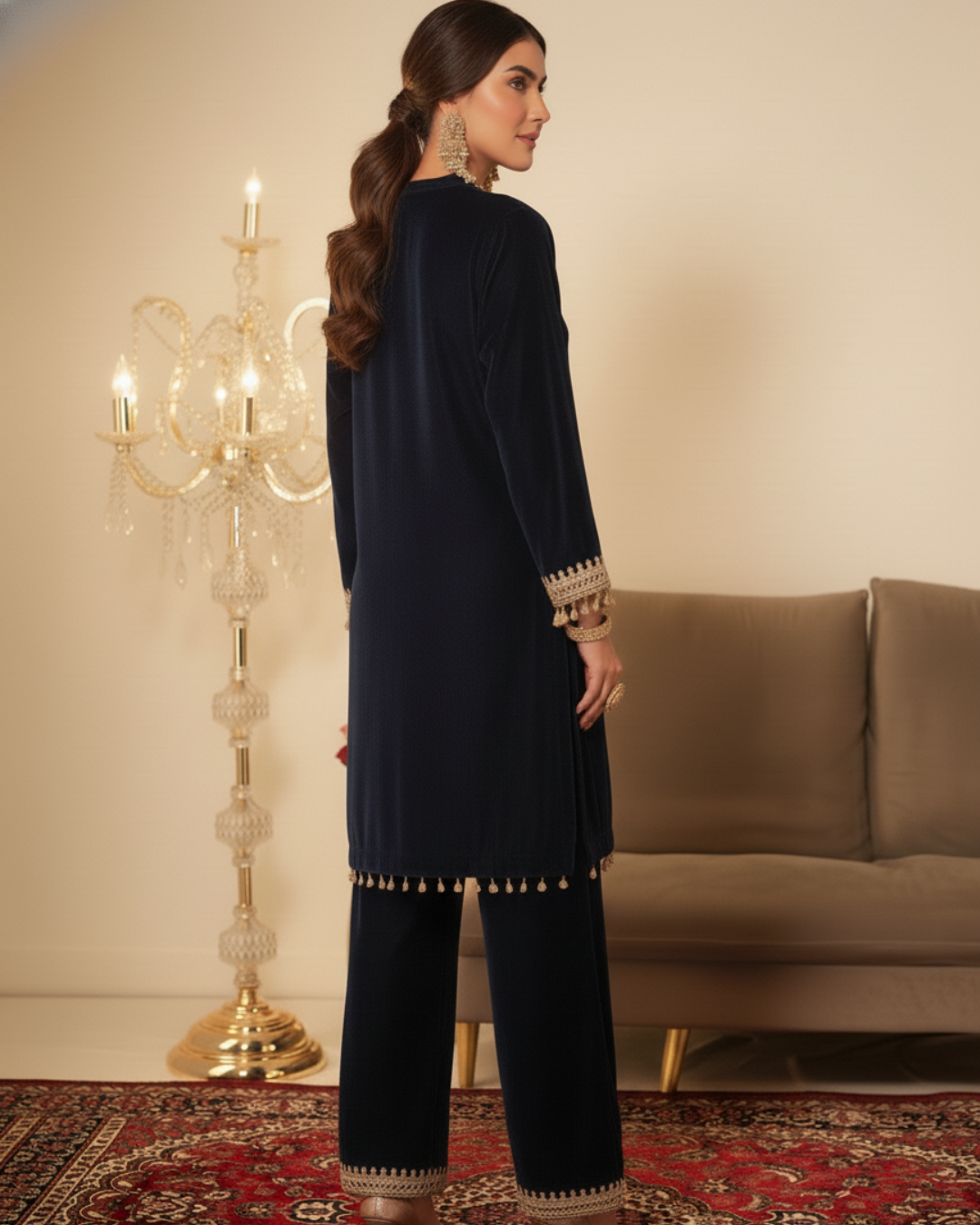Ethnic Navy Blue Designer 2 Pc Velvet Suit with Beautiful Gotta Lace Work for Parties