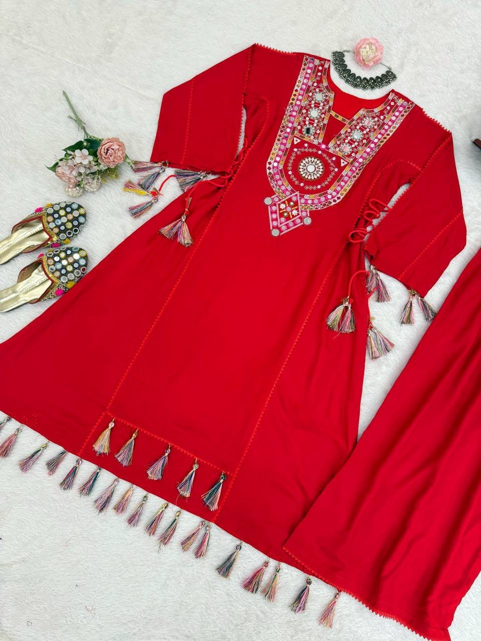 Ethnic Red Rayon Co-ord Set with Thread & Mirror Work