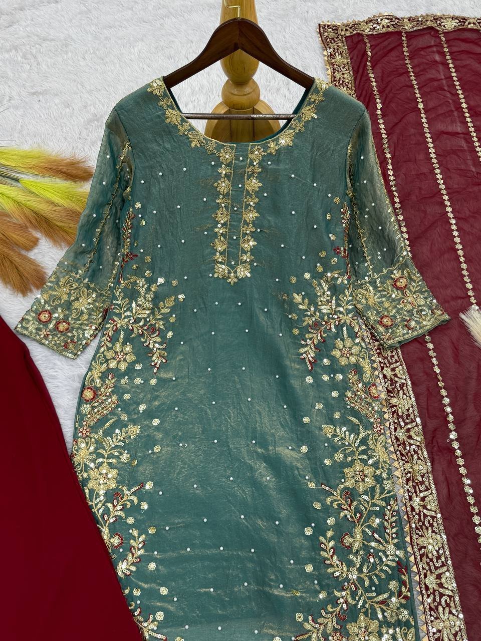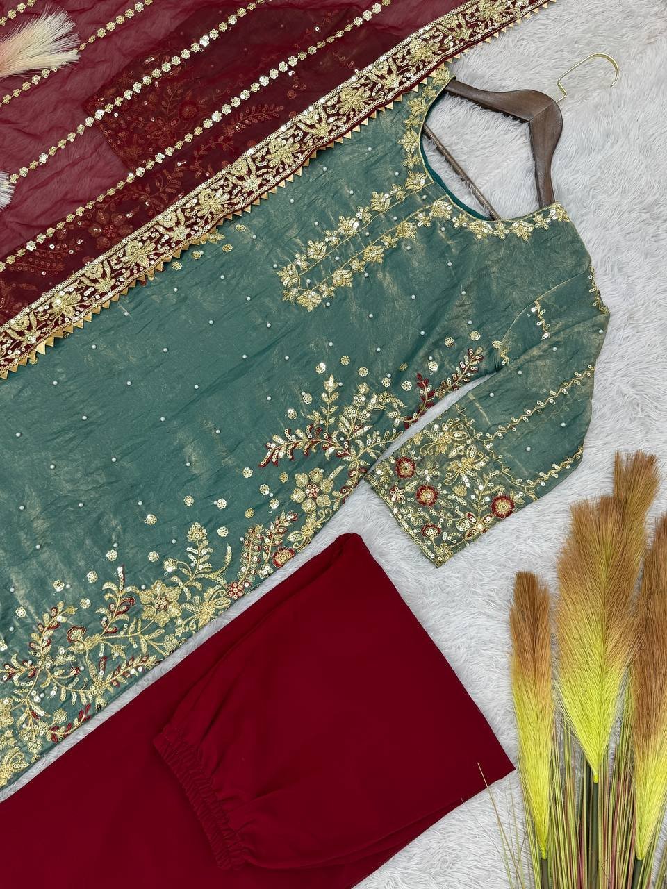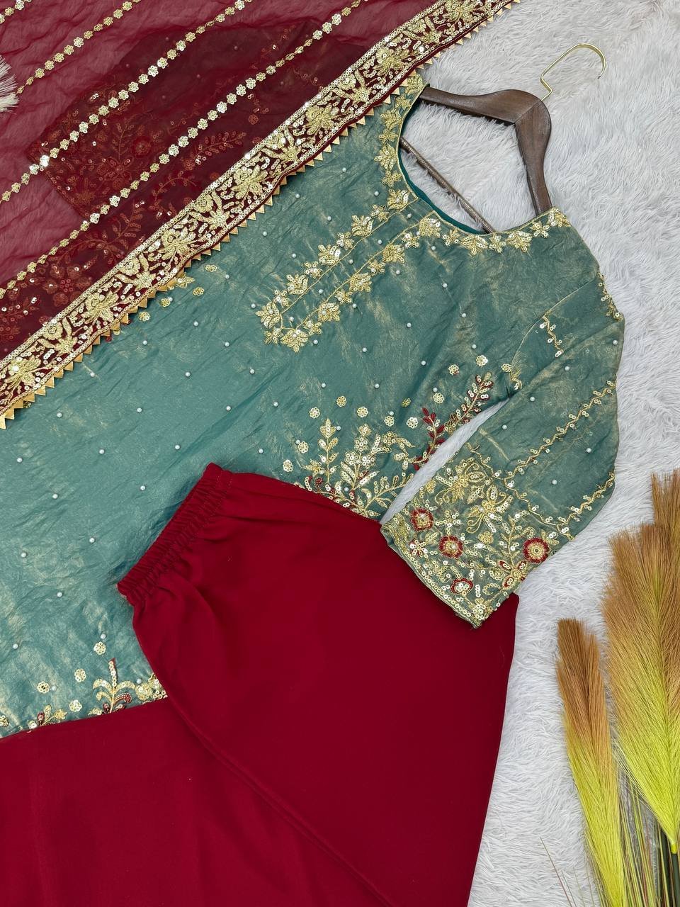 Fendy Silk Aqua Green Embroidered & Moti Work Ethnic Palazzo Set for Festivals