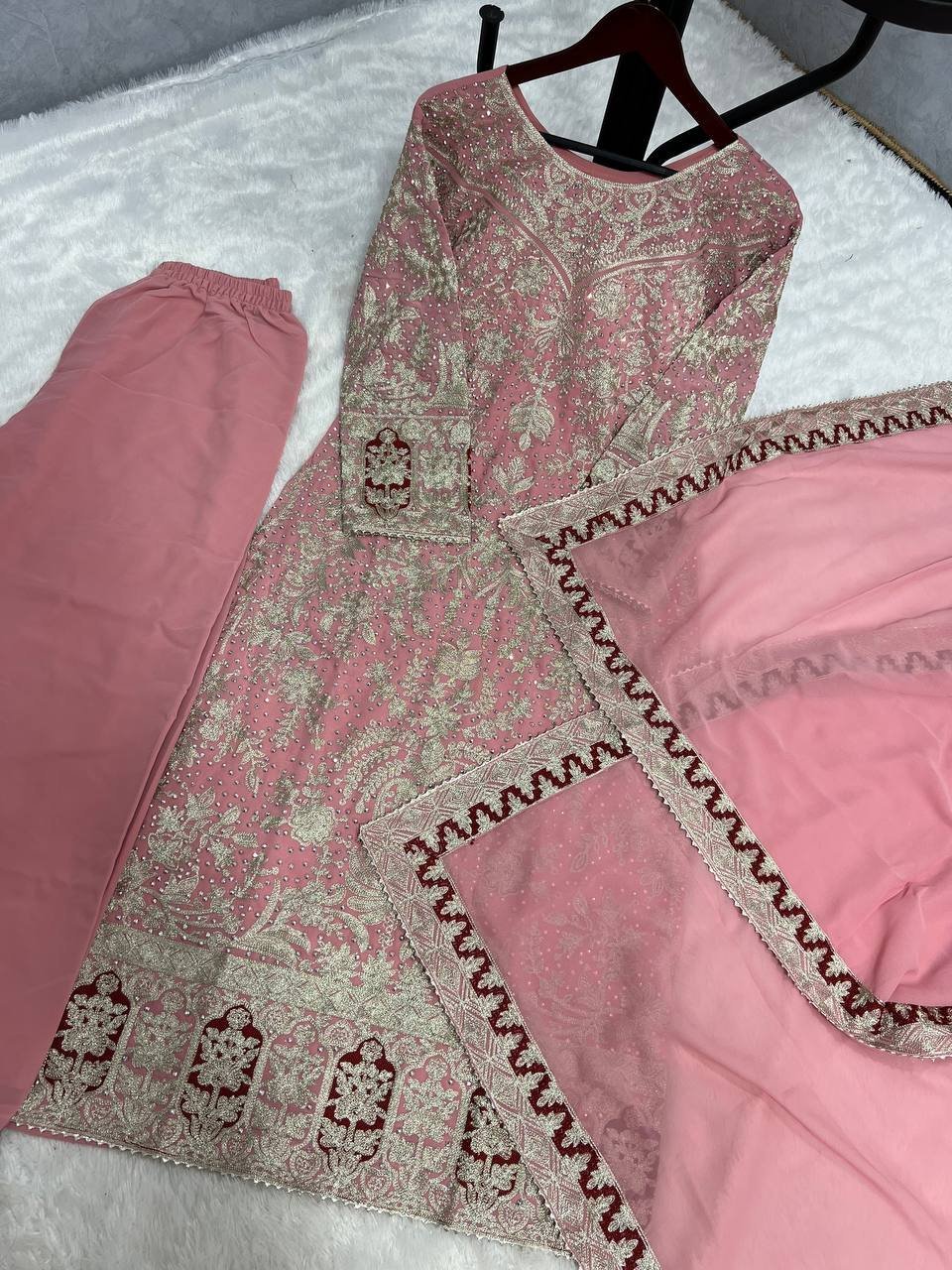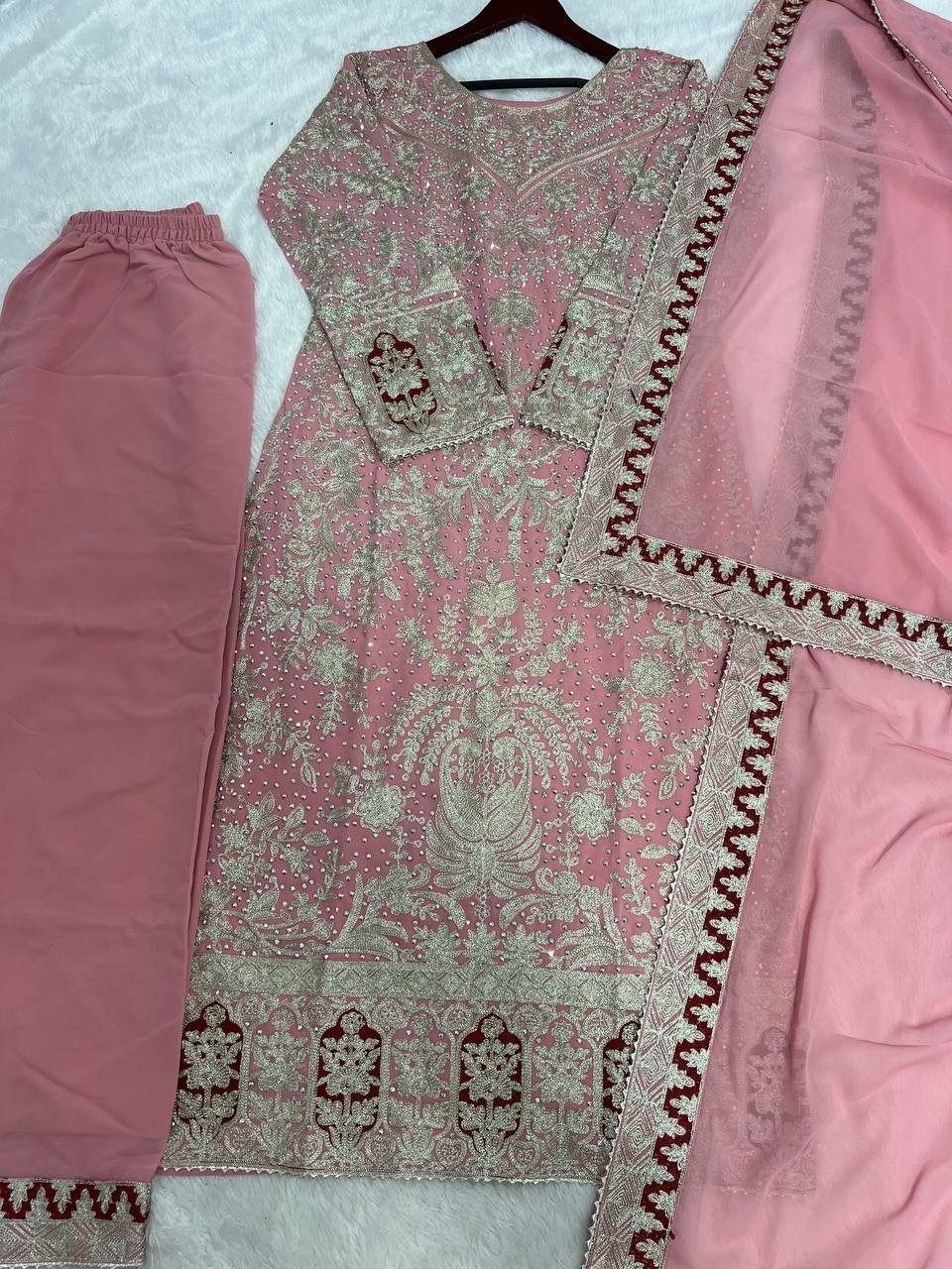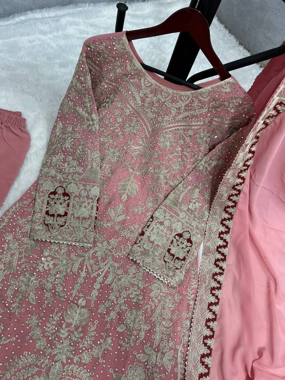 Georgette Embroidery & Diamond Hnadwork Pink Kurta Palazzo Set for Weddings