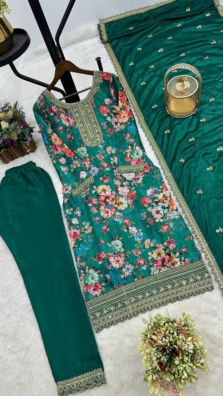 Green Floral Printed Chinon Silk Suit Set with Sequence & Coding Work