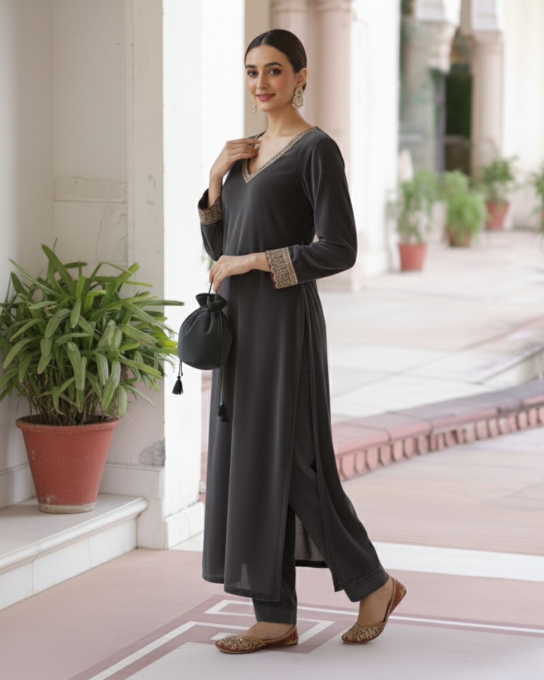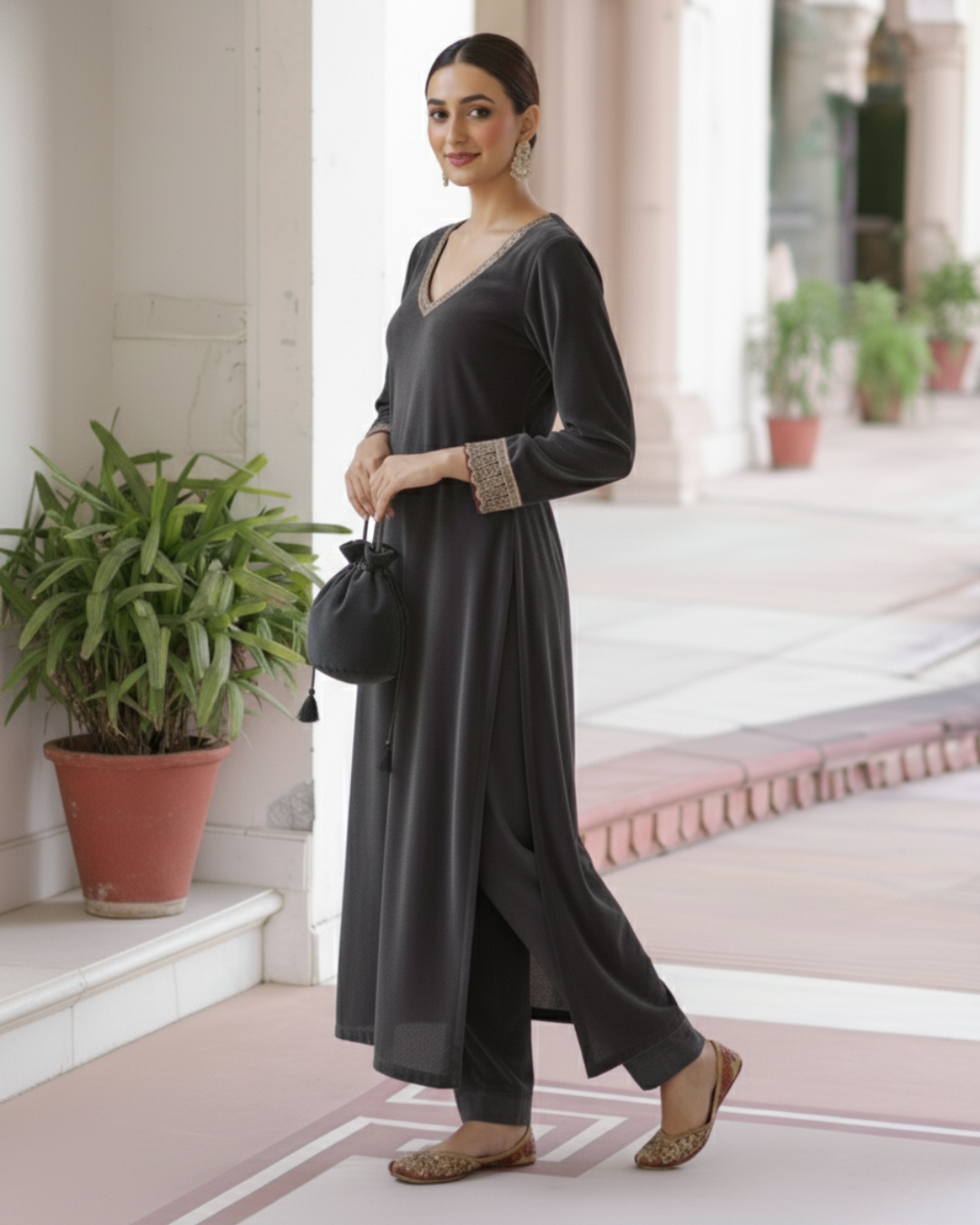 Grey Velvet Straight-Cut Suit with Subtle Gotta Lace Work & Potli Bag