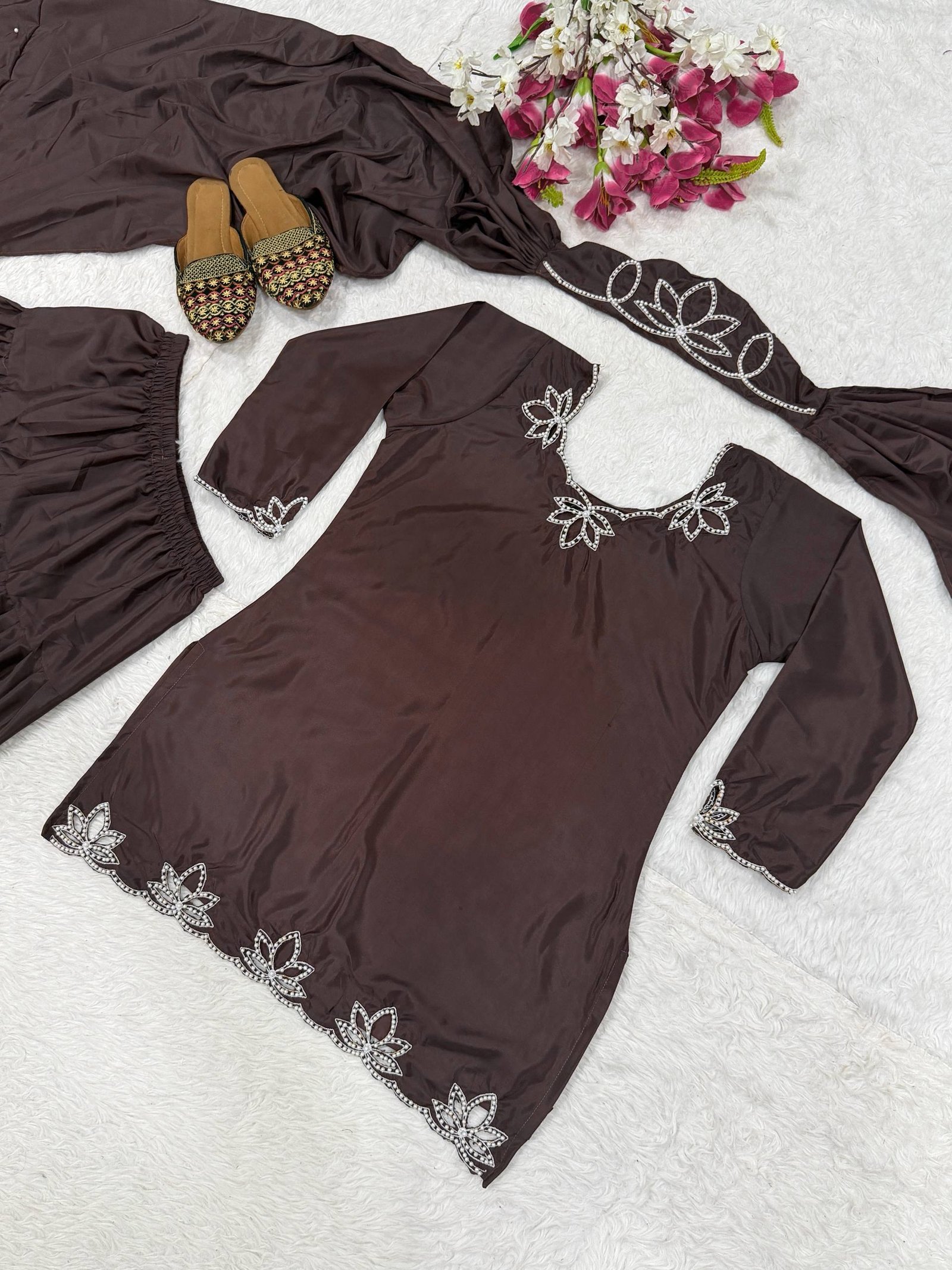 Fabric: Heavy Natural Crepe with embroidery and moti work (full sleeves)