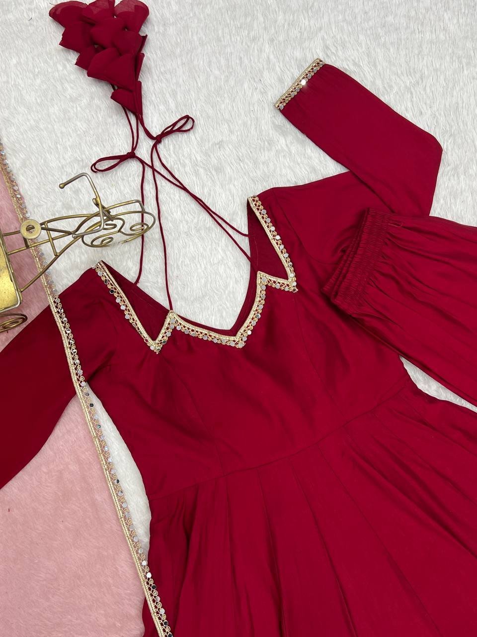 Maroon Roman Silk Chanderi Anarkali Set with Lace & Mirror Work