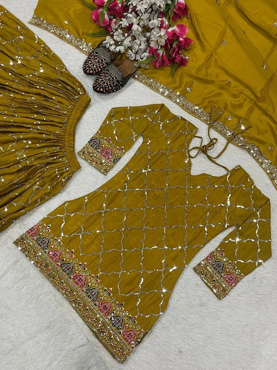Mustard Chinon Silk Kurta Sharara Set with Sequins Embroidery Work for Women