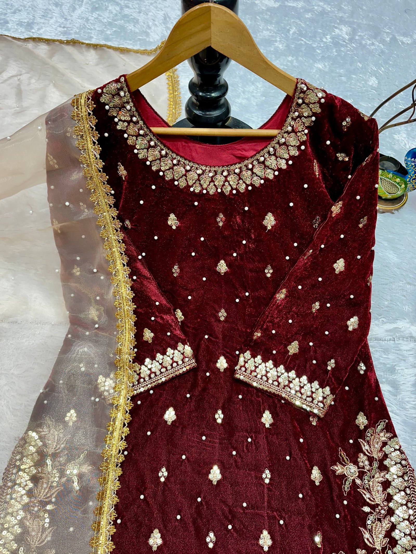 Naazish Designer Maroon Viscose Velvet Embroidered Suit Set