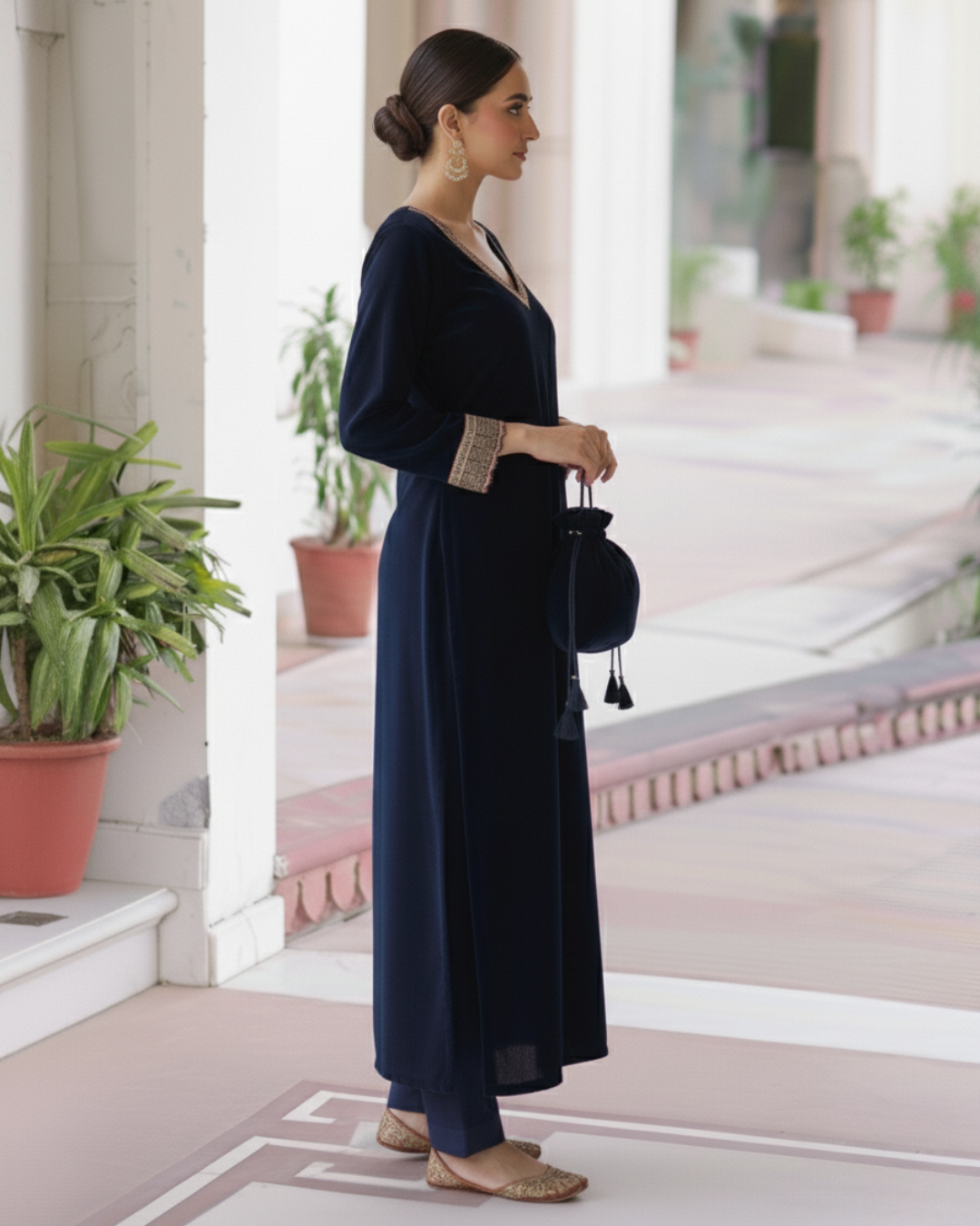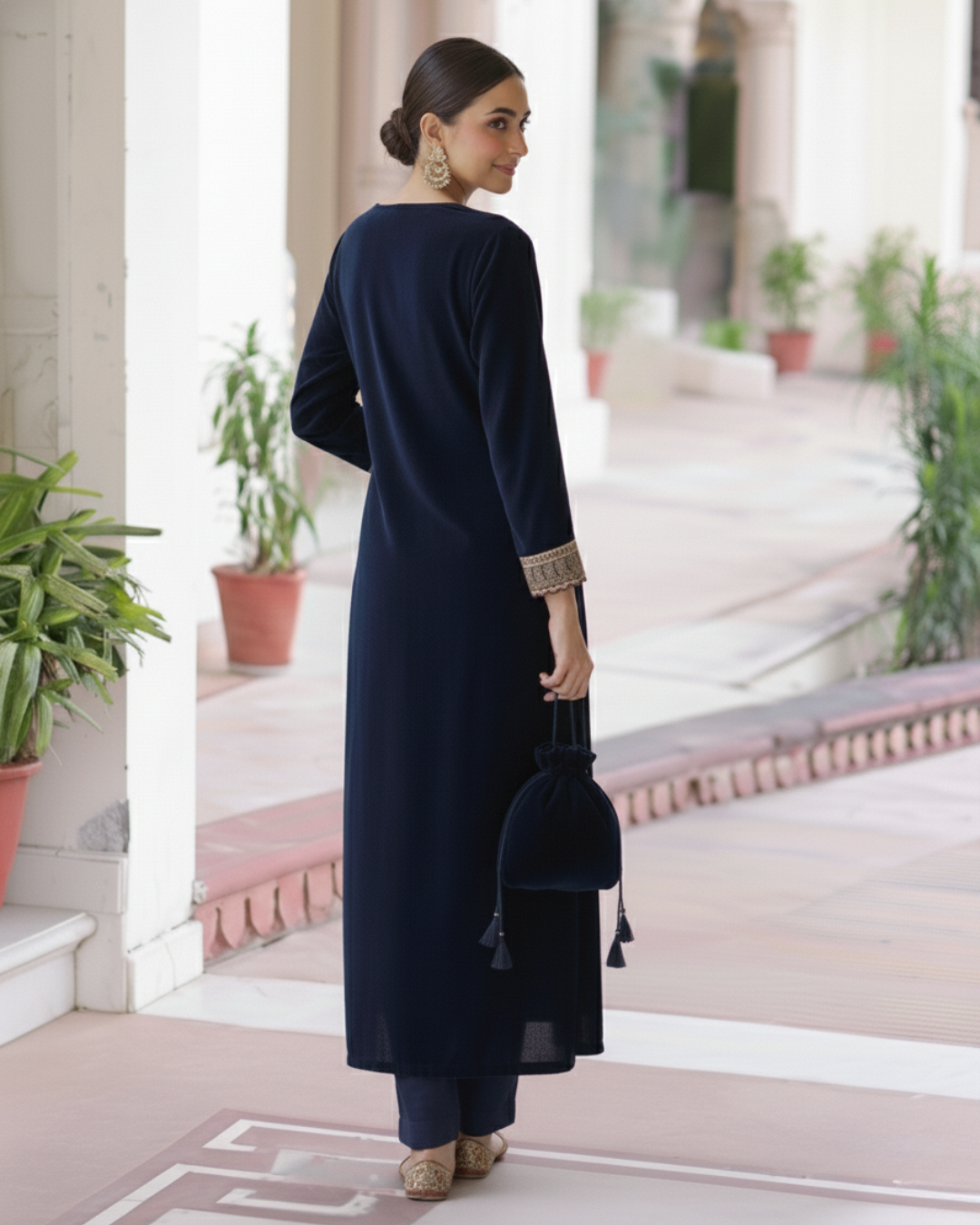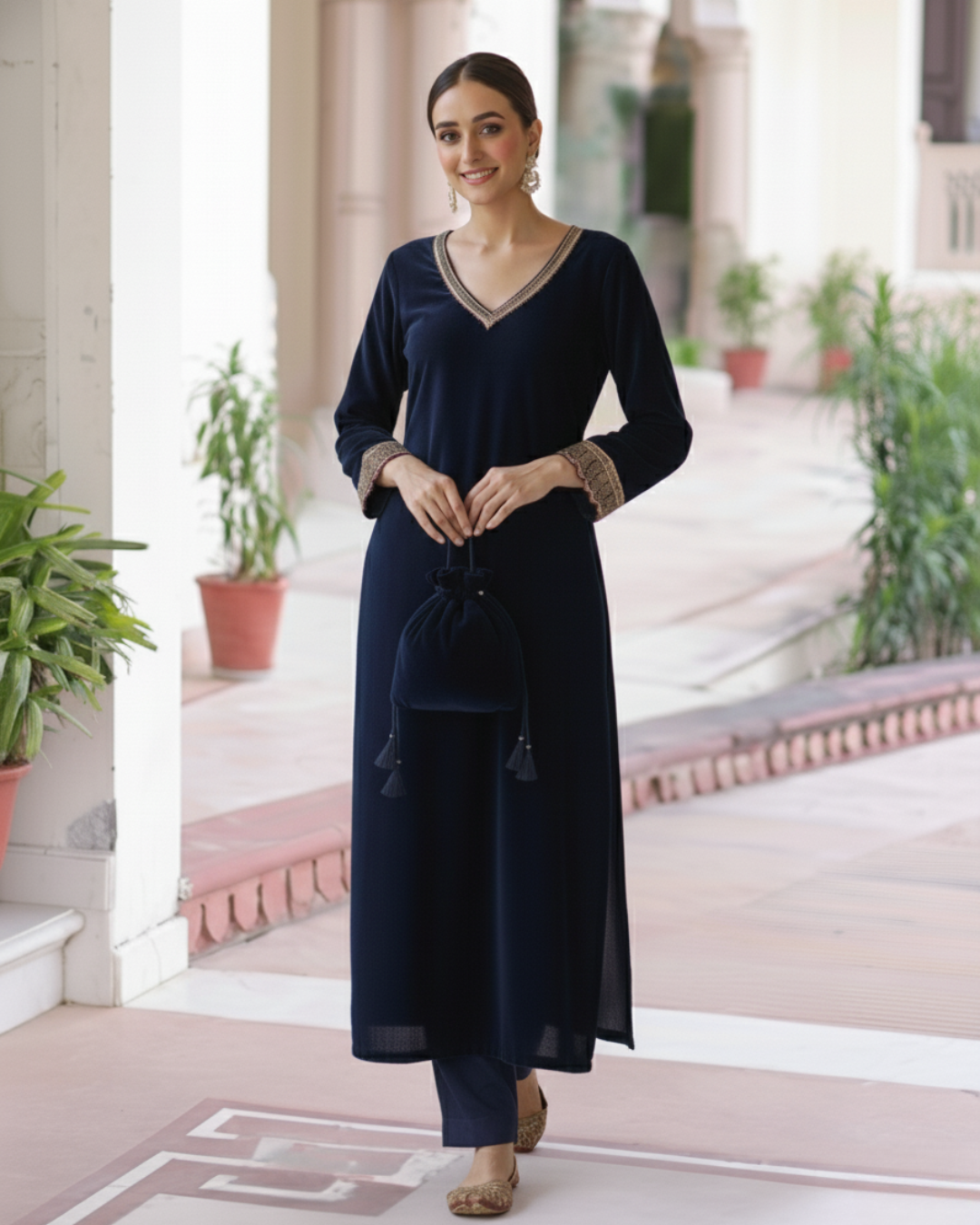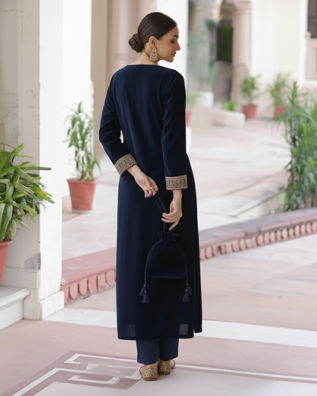 Navy Blue Velvet Straight Kurta Set with Elegant Gotta & Potli Bag