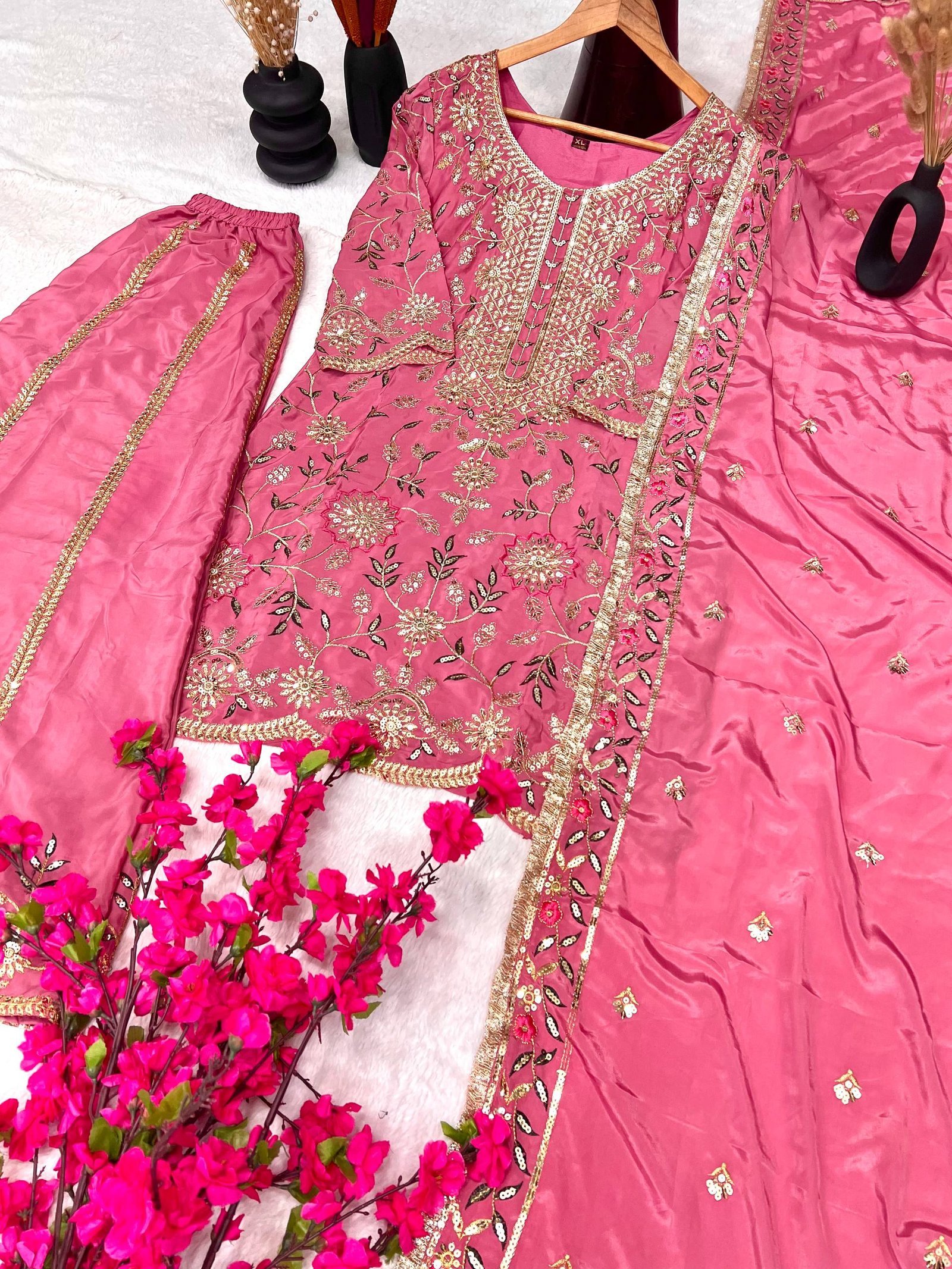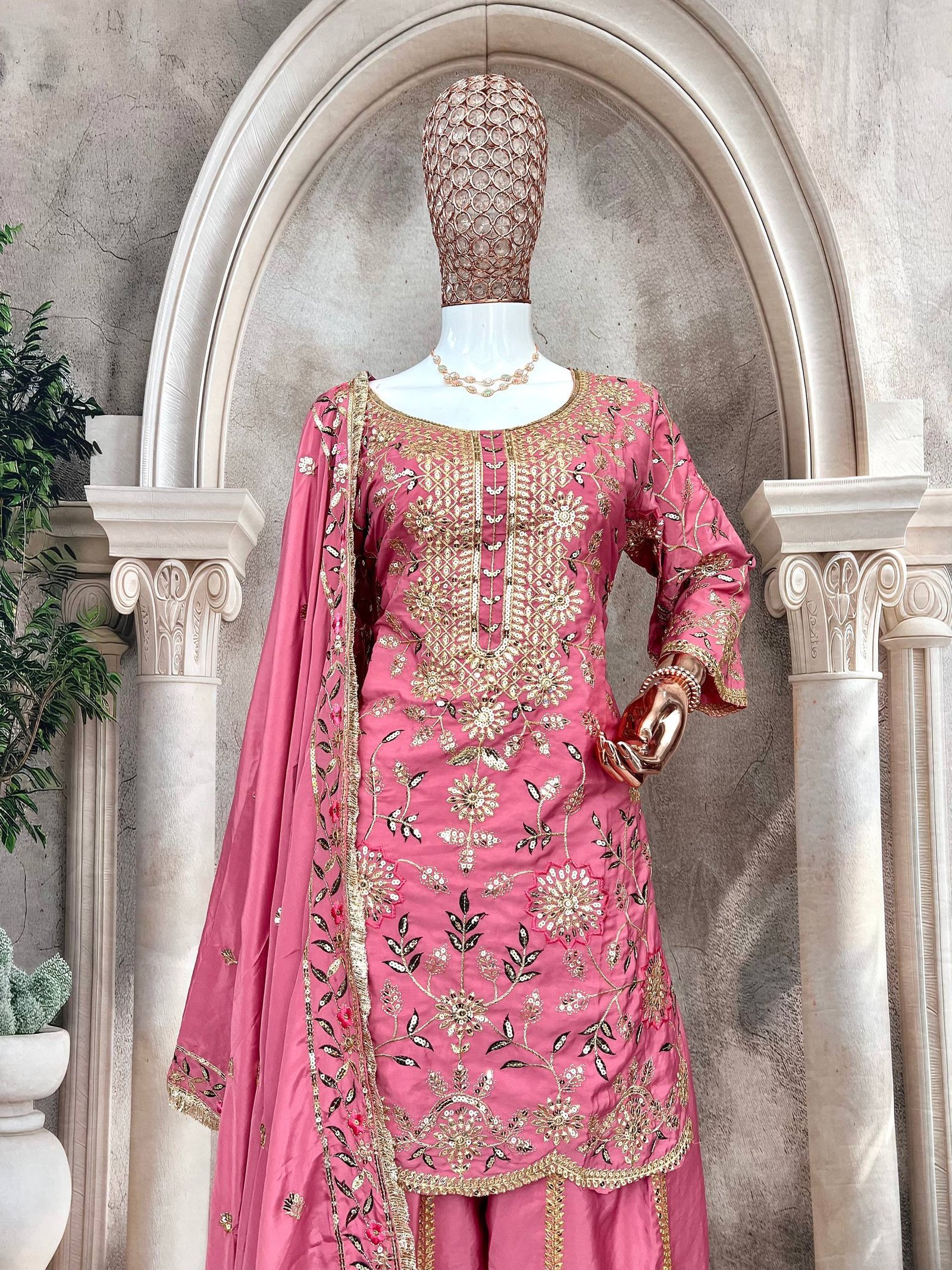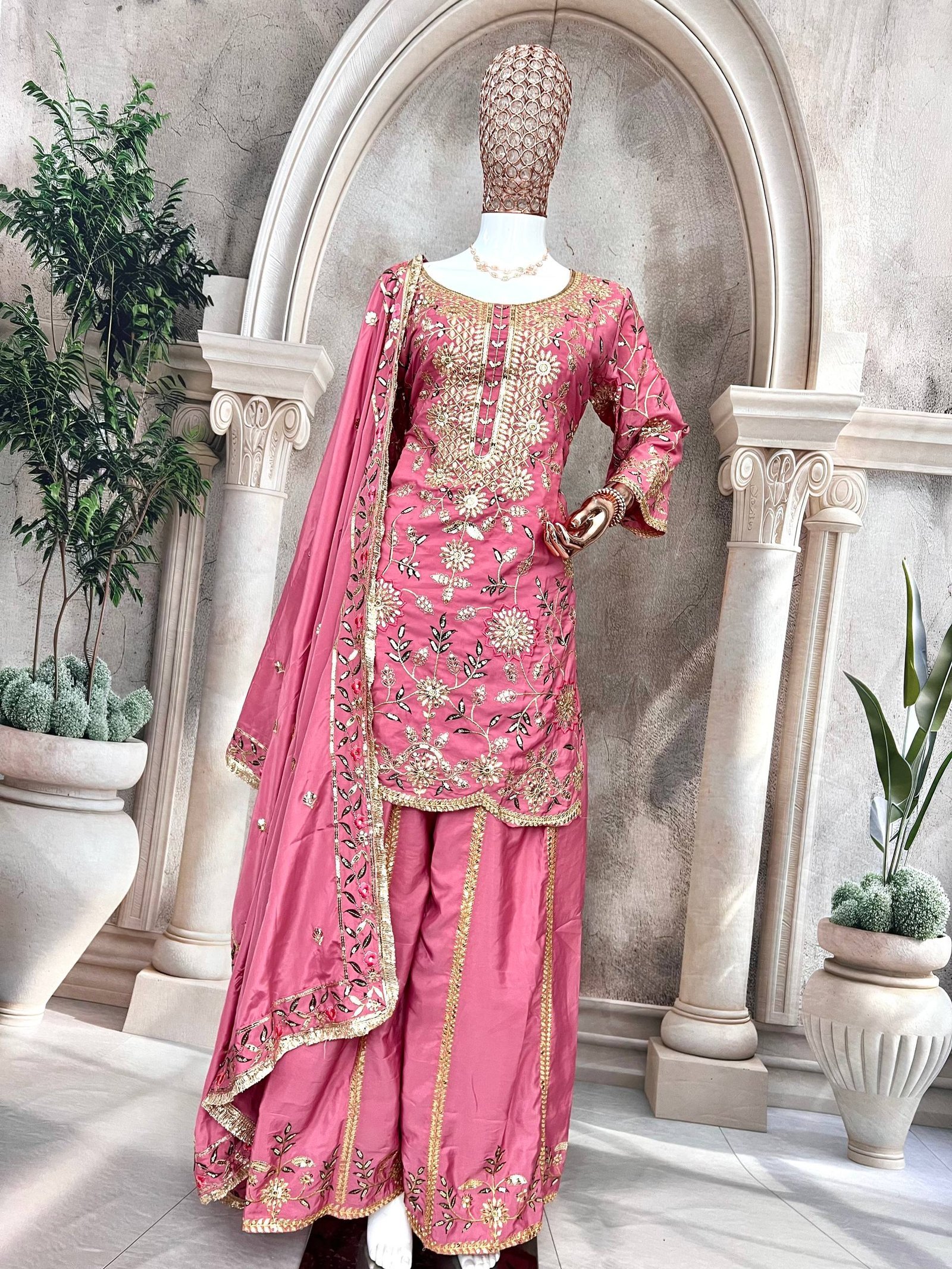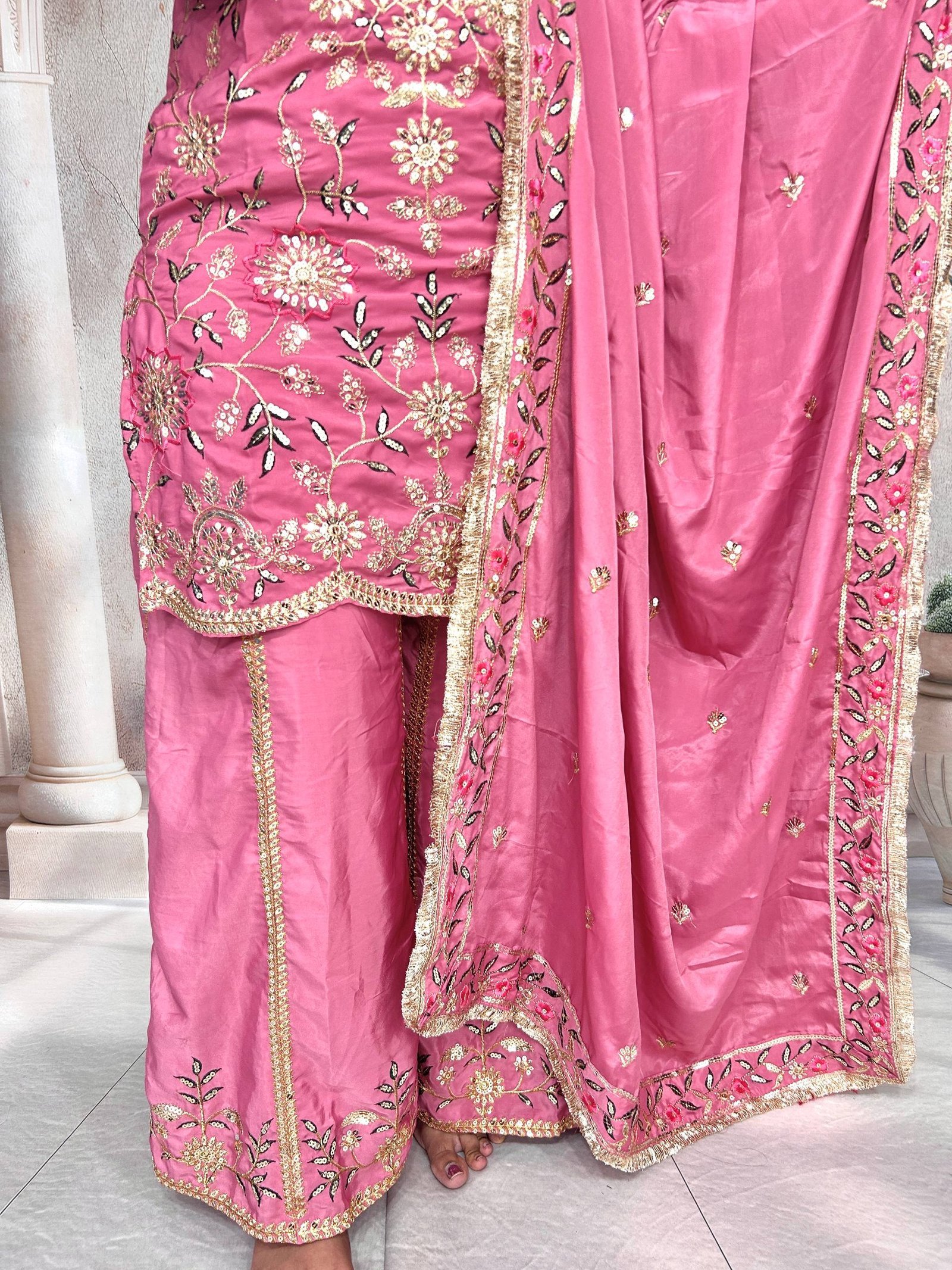 Pink Crepe Silk Kurta Sharara with Multi Needle Embroidery Work