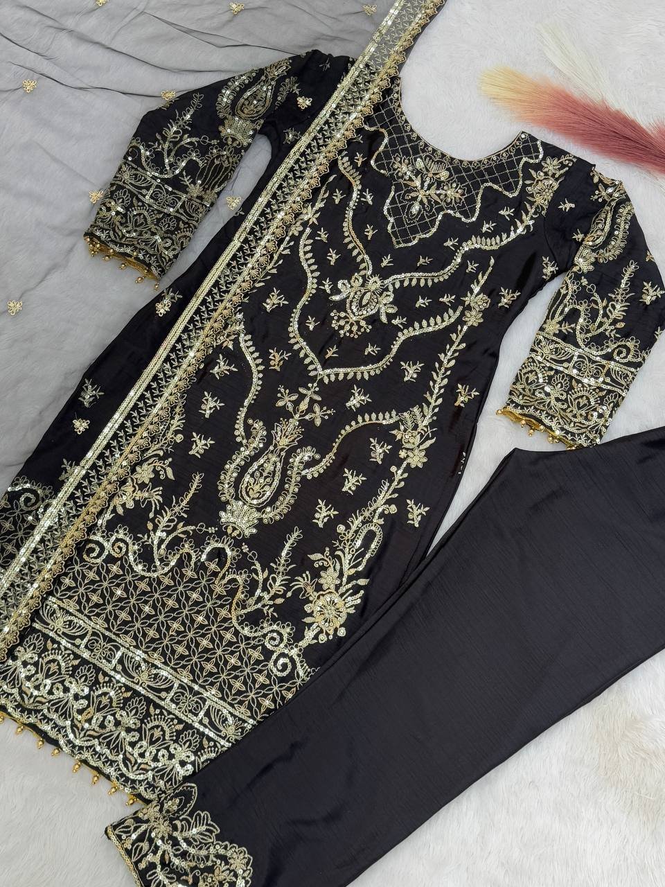 Premium Black Chinon Silk Straight Fit for Eid with Sequins, Embroidery & Moti Work