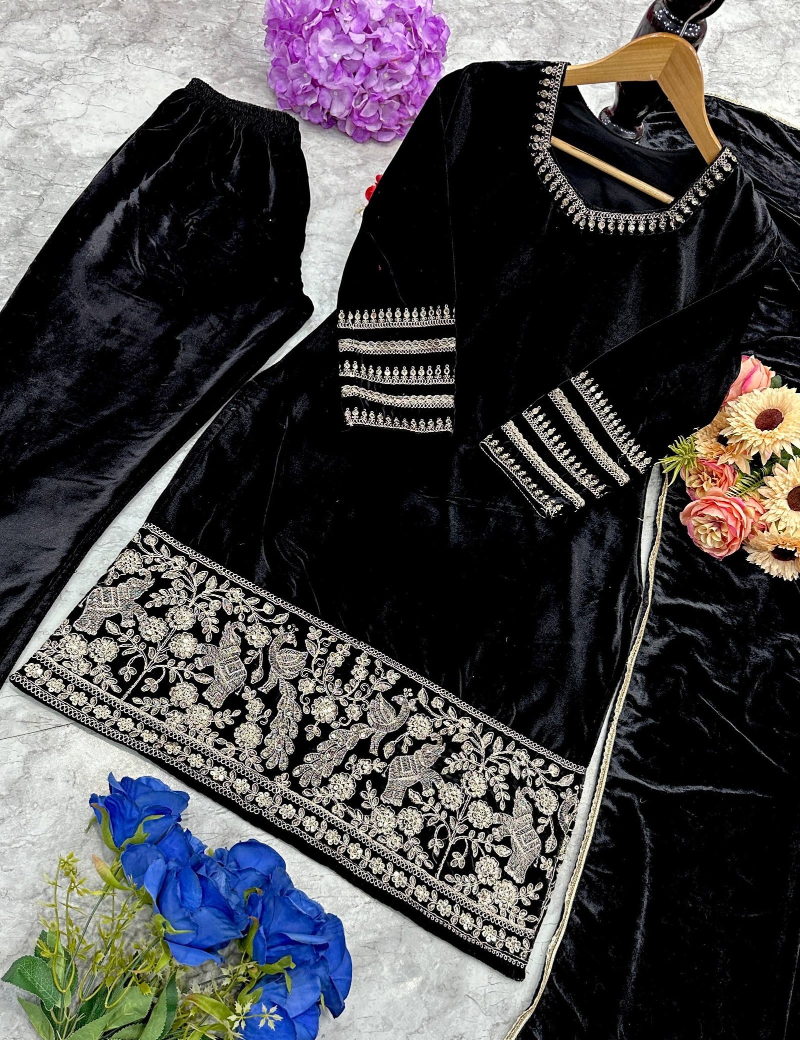 Premium Black Velvet Embroidered Kurta set with Dupatta