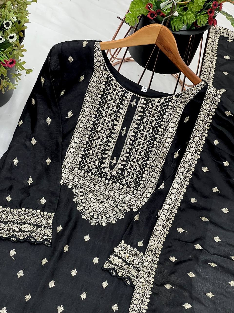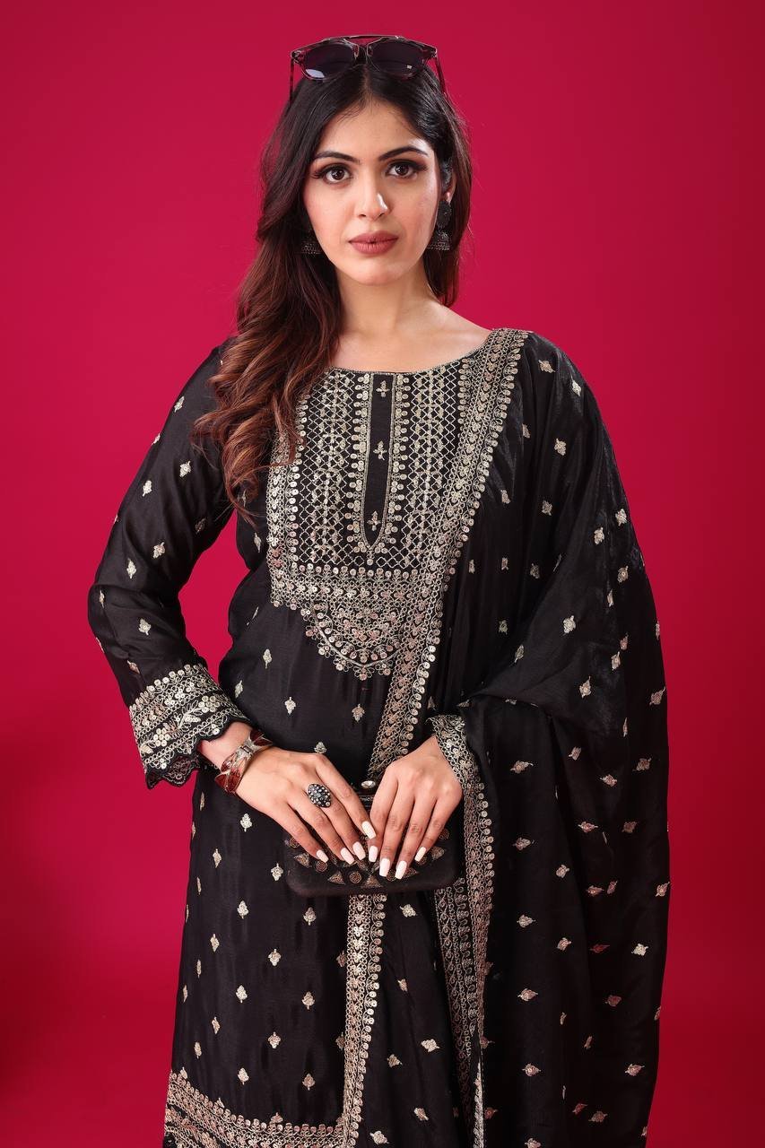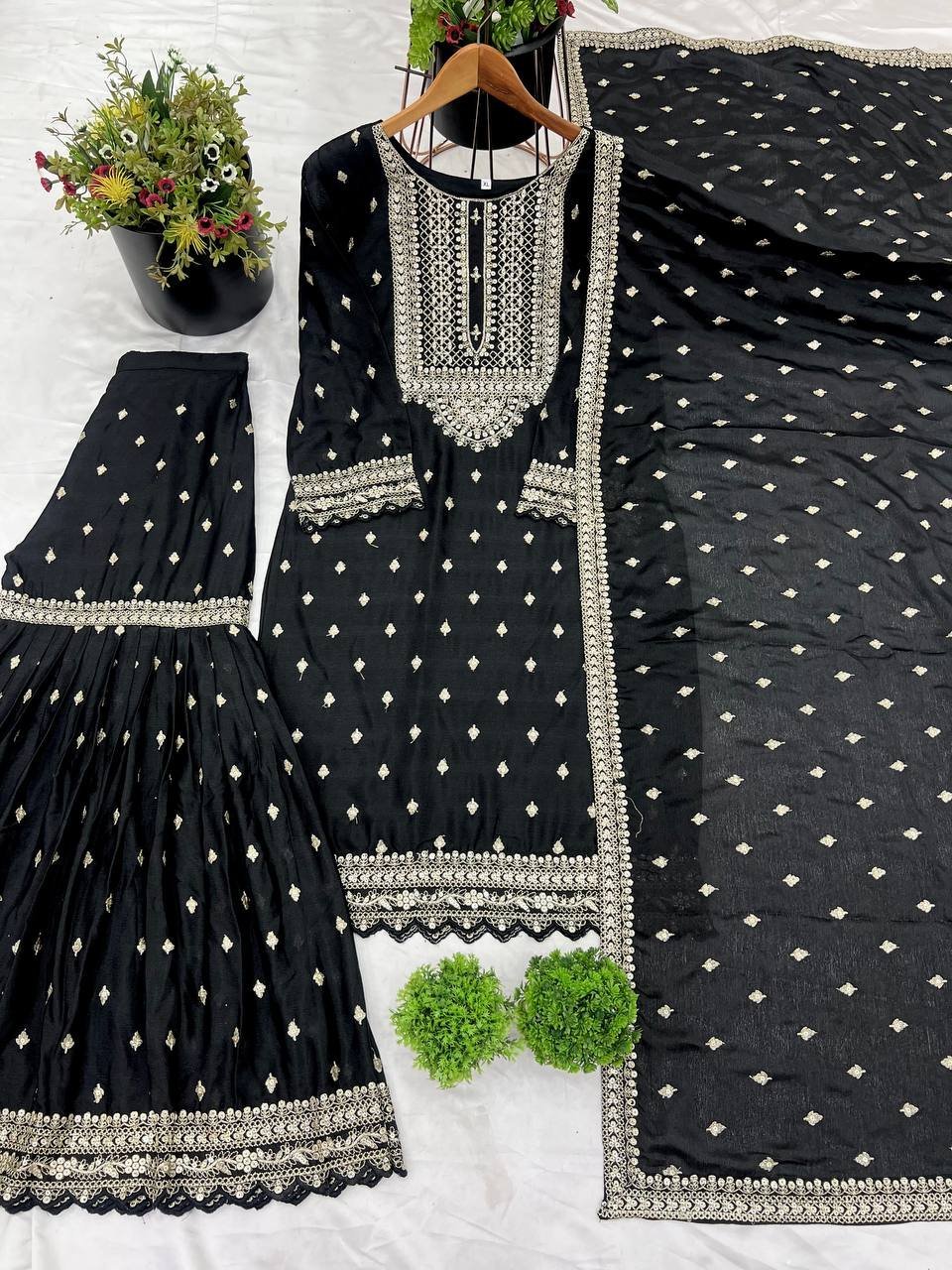 Ready to Wear 3 Pc Chinon Silk Sequins Embroidered Kurta Sharara in Black Color