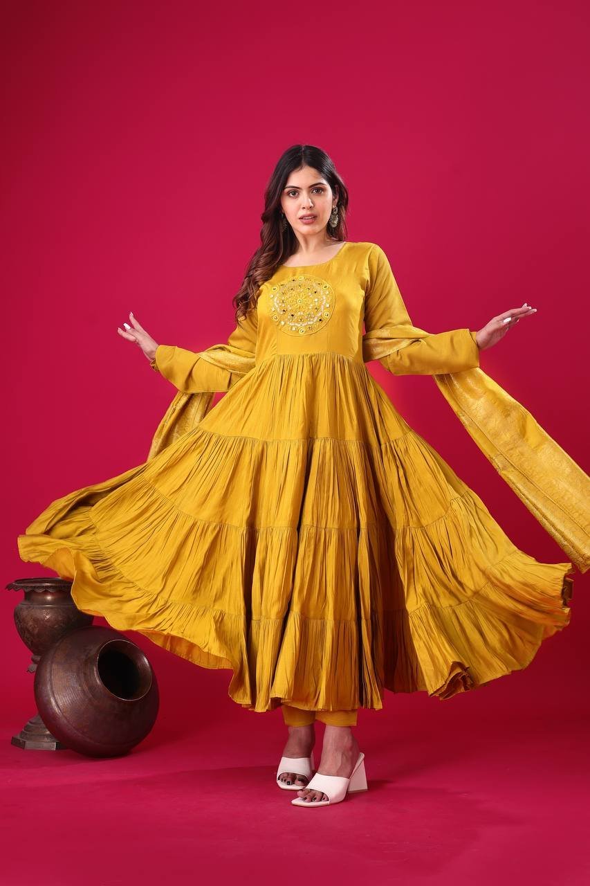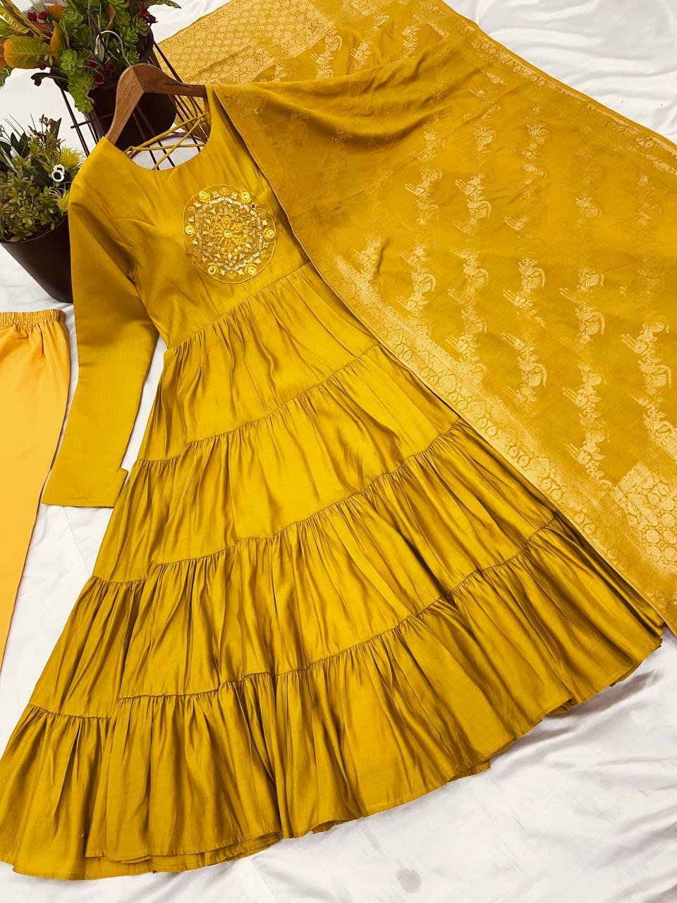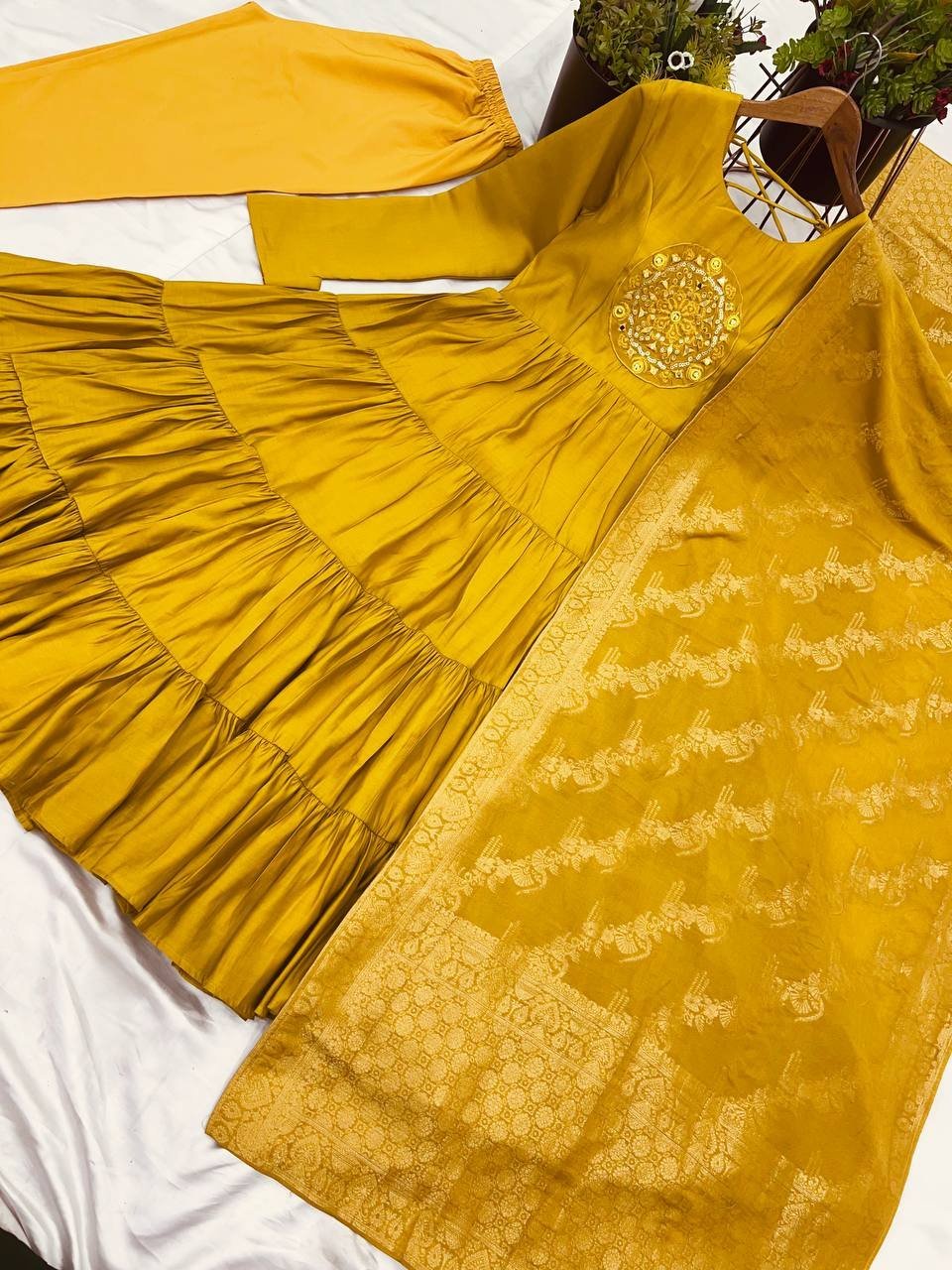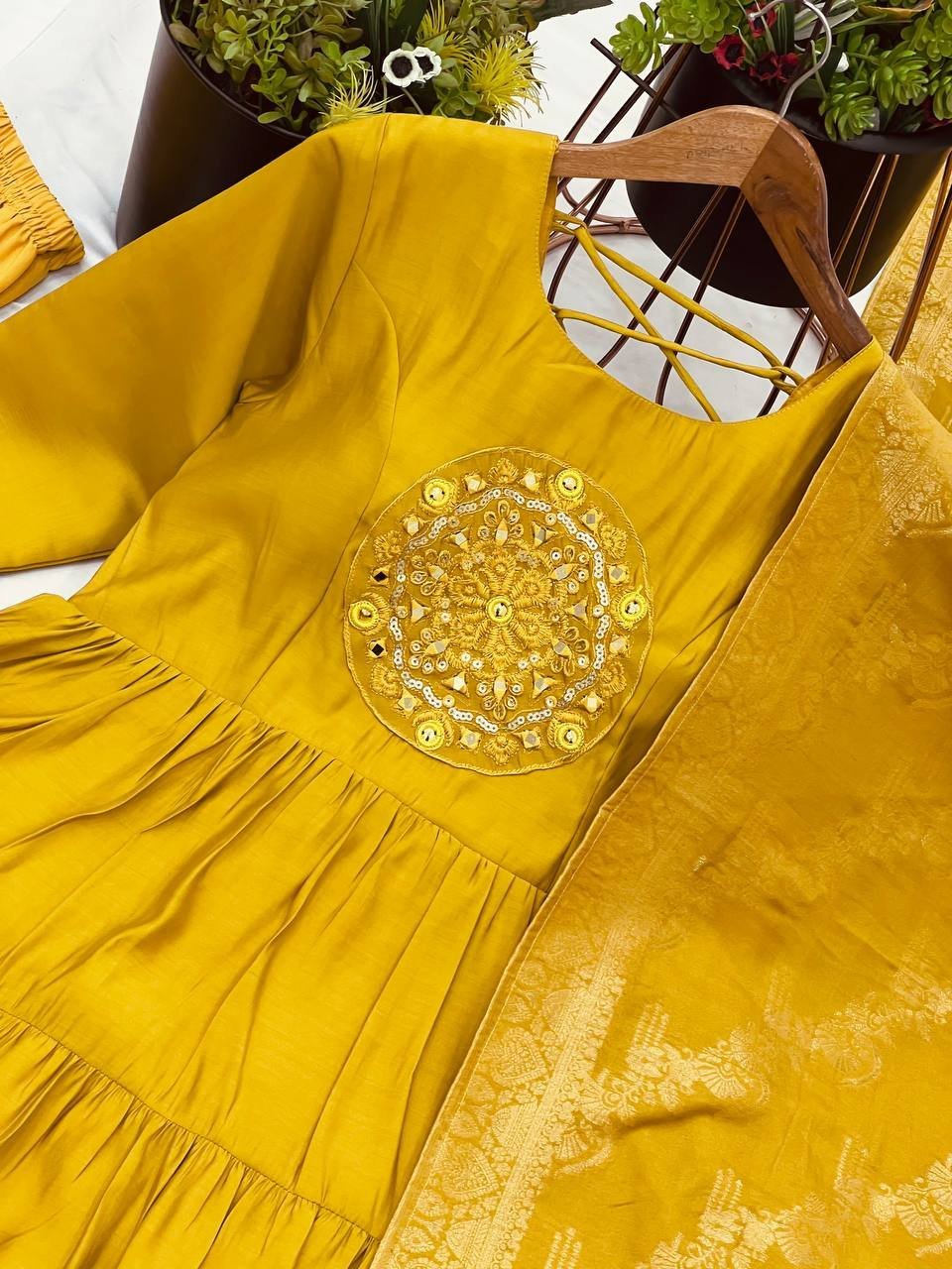Ready To Wear Yellow Anarkali with Sequins Embroidery Work & Dupatta