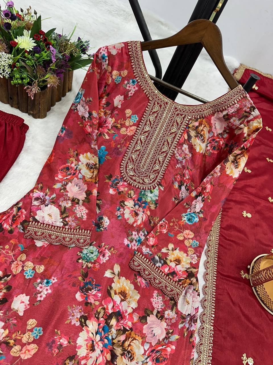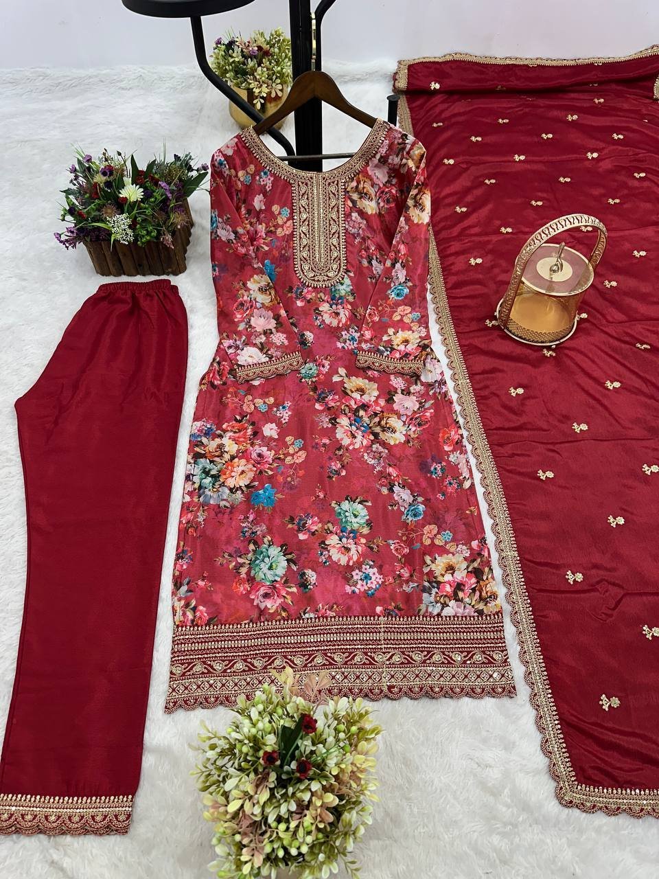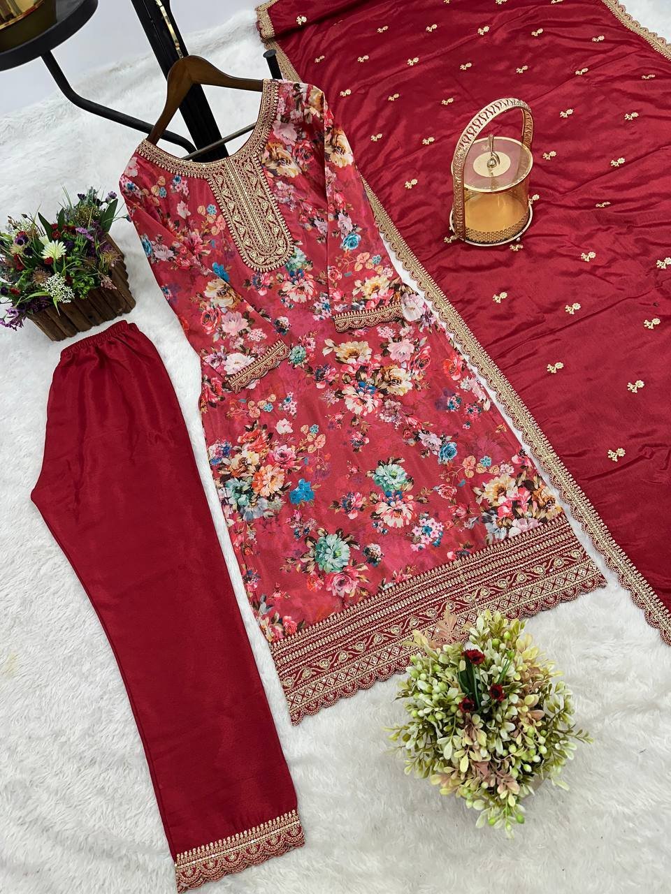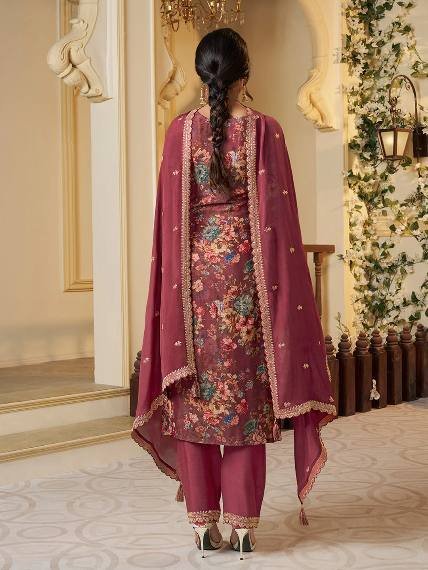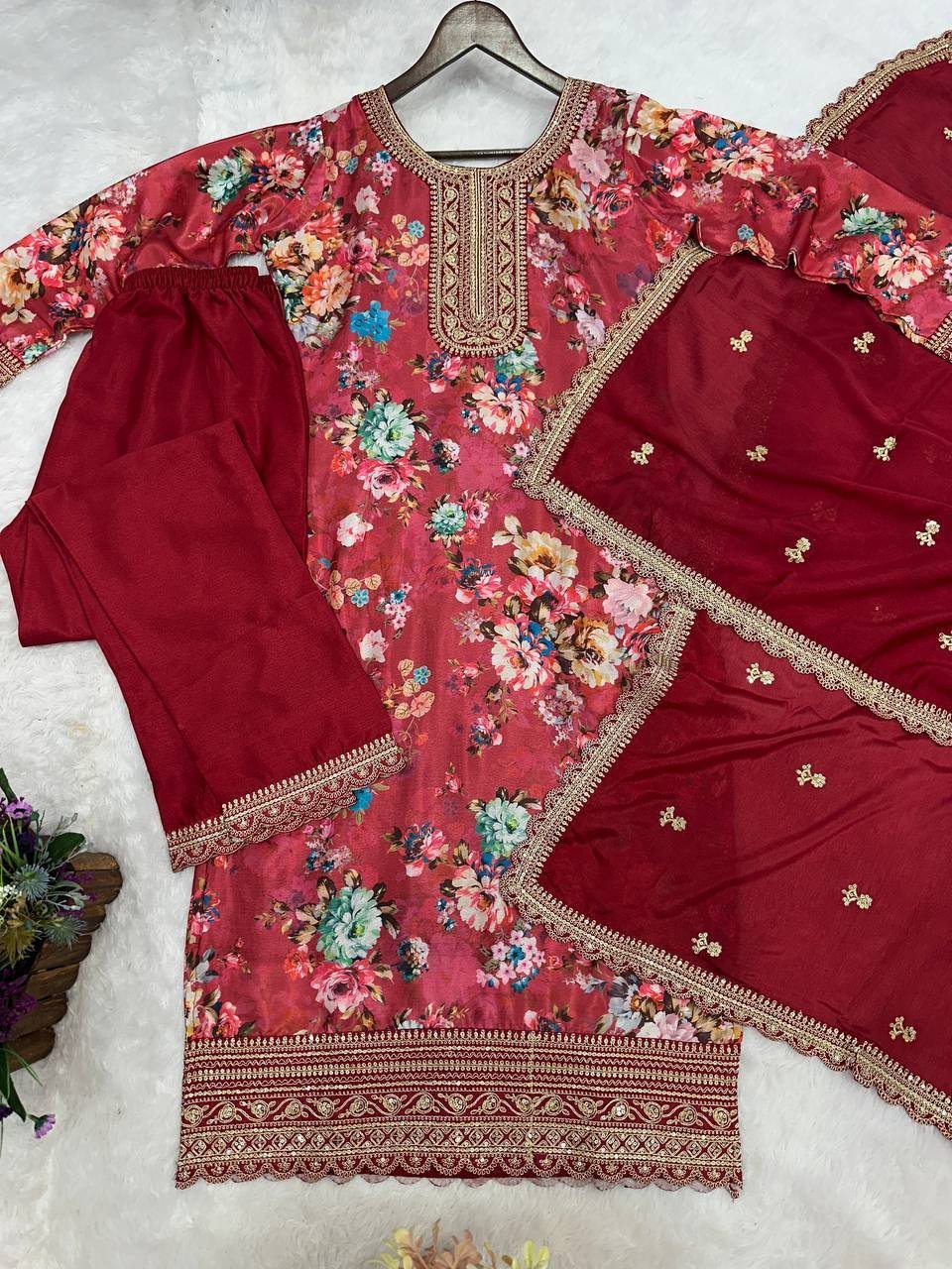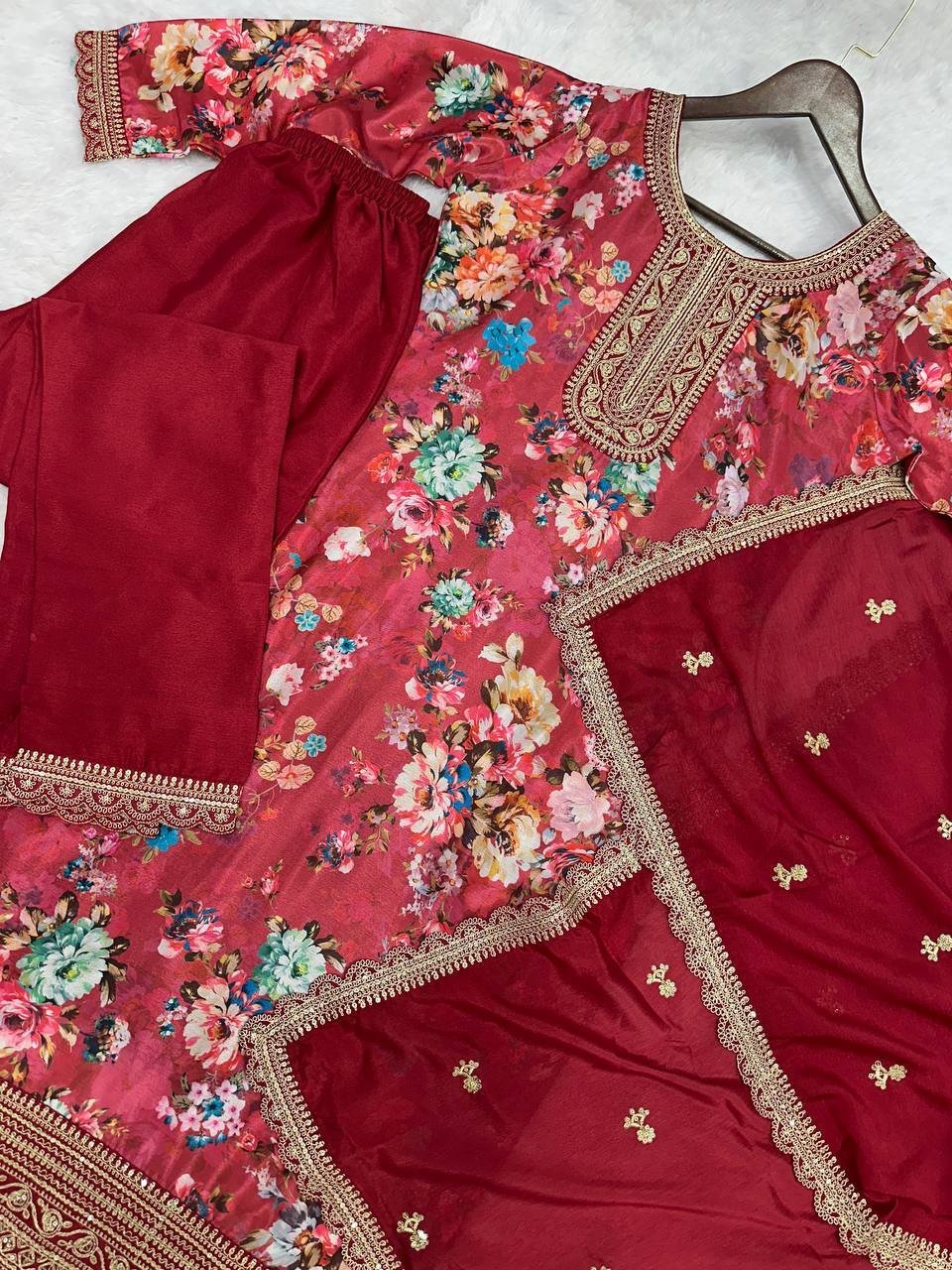 Red Floral Printed Chinon Silk Suit Set with Sequence & Coding Work