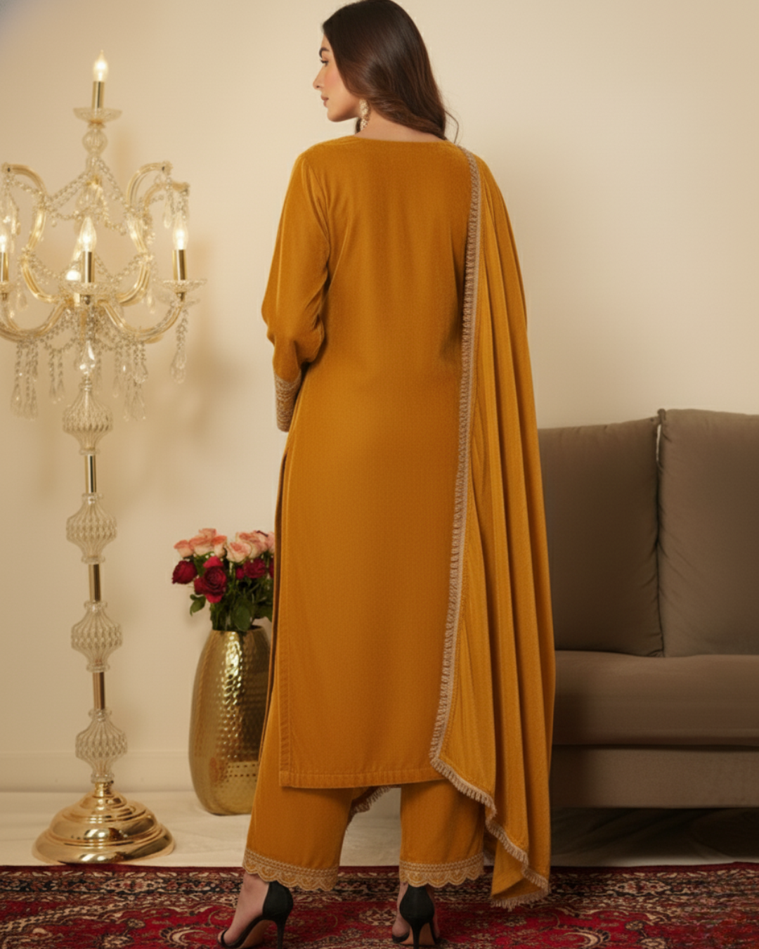Yellow Velvet Gotta Lace Work Pakistani Style Ready to Wear 3 Pc Suit for Winters